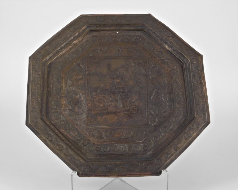 Vassoio o piatto ottagonale, decorato con motivi fitomorfi su tutta la superficie, a cui sono aggiunte quattro figure antropomorfe ai margini della cornice del riquadro centrale e una figura zoomorfa (uccello)nella parte sottostante la cornice. Nel riquadro centrale compare una scena tratta dalla mitologia indiana che ha per protagonista la dea Durga.