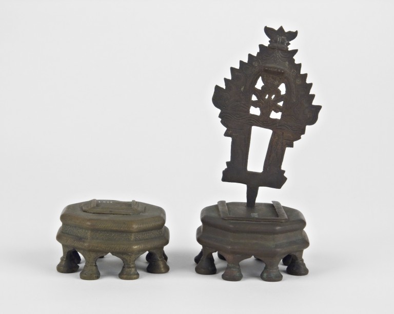 Il vero soggetto di entrambi i manufatti, l'idolo, manca dalle rispettive sedi, sulle basi. L'aureola che avrebbe dovuto incorniciare una delle due figure divine è mancante, mentre quella presente, inserita precariamente sulla base riproduce decorazioni fitomorfe (fiori e foglie) e un piccolo ma riconoscibile serpente (naga) a cinque teste, sovrastato da un fiore di loto.
