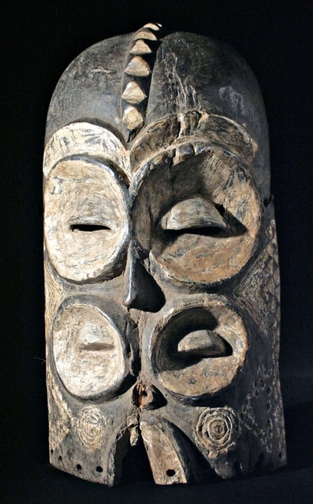 Maschera facciale a sezione semicircolare. Caratterizzata da quattro orbite incavate e imbiancate, di cui quelle superiori più grandi presentano occhi ellittici con la palpebra superiore sporgente e quelli inferiori appaiono aperti. Il naso regolare e sporgente è posto appena al di sotto delle orbite. Una corda di fibra intrecciata di colore rossastro è sottesa tra i fori ai lati degli occhi. La superficie è ricoperta da una patina opaca nerastra.