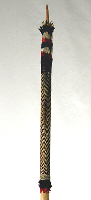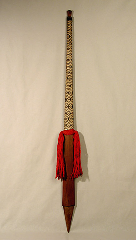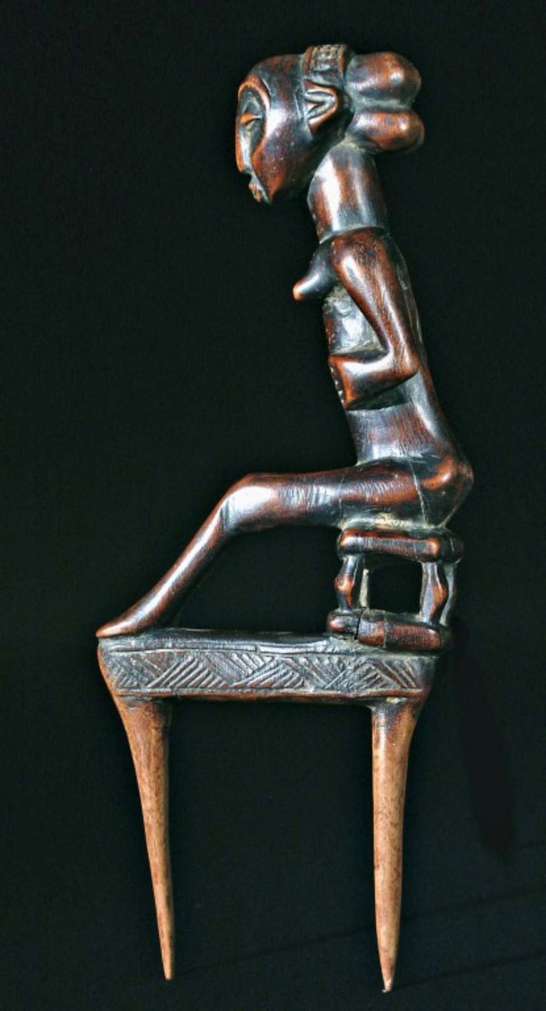 Spillone per capelli in legno decorato con incisioni geometriche e scolpito con figura antropomorfa. La rappresentazione femminile appare seduta su uno sgabello e appoggia le braccia ai lati del ventre. Sull'oggetto è presente una patina lucida di colore marrone.