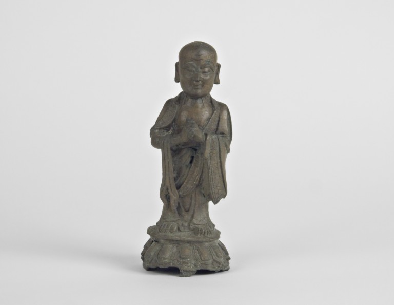 Il soggetto raffigurato è di difficile riconoscibilità in mancanza di attributi specifici. Nel buddhismo tradizionalmente sono ricordati 16 #arhat# (sanscrito) o #luohan# (cinese), monaci realmente esistiti che hanno raggiunto lo stato di #nirvana# in vita, ma successivamente si è arrivati a contarne 500. Per tale ragione è ancor più complesso il riconoscimento della statua in esame, che senza dubbio fa parte di questa categoria di idoli. La statua può essere riconducibile alla figura di #Kasyapa#, ma solo per la notorietà del soggetto nelle collezioni europee di statuaria buddhista.