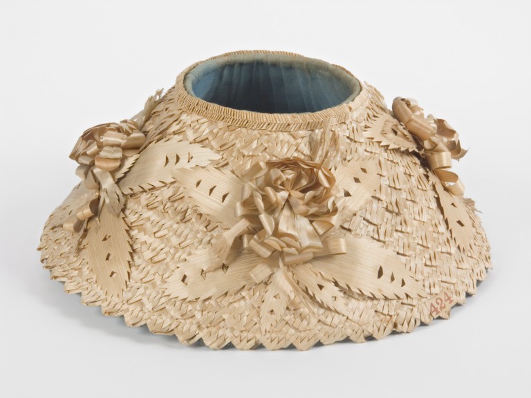 Oggetto realizzato a partire da sottili strisce di fibre vegetali intrecciate fra loro a costituire nastri poi avvolti a spirale e cuciti insieme per ottenere una forma tronco-conica. Il bordo superiore esterno presenta una striscia di fibre vegetali intrecciate a "spina di pesce". Sulla superficie esterna sono stati cuciti 4 fiori con foglie e nastri ottenuti ritagliando e modellando la stessa fibra vegetale del supporto. La superficie interna è stata rivestita con una stoffa leggera di colore azzurro piegettata e cucita con filo bianco.