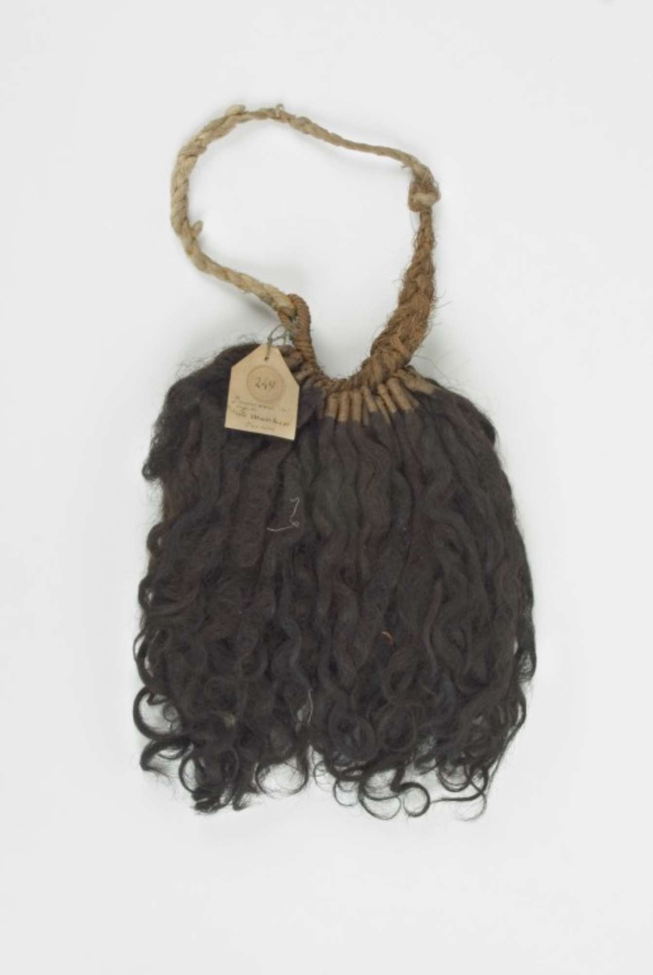 Oggetto costituito da 99 ciuffi di capelli umani di cui l'estremità tagliata è avvolta da un sottile filo vegetale per mezzo del quale è fissata ad una treccia a mò di "spina di pesce" fatta dello stesso materiale. Le due estremità della treccia sono legate ad un cordino realizzato con una fibra vegetale diversa per materia prima, lavorazione e colore.