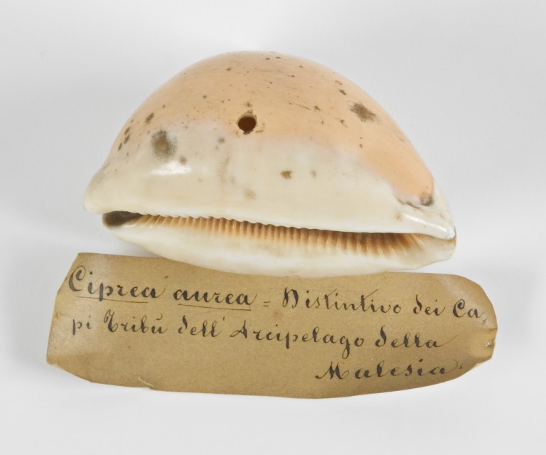Vi è una dicotomia nella scheda storica del Museo. Da una parte viene indicato come area geografico-culturale "Melanesia, Nuova Zelanda", ma in una nota si legge che in un cartellino imballato con l'oggetto è indicata compe provenienza la Melanesia. Si tratta di una conchiglia moldo diffusa e largamente usata. Vi sono confronti con la Nuova Guinea.