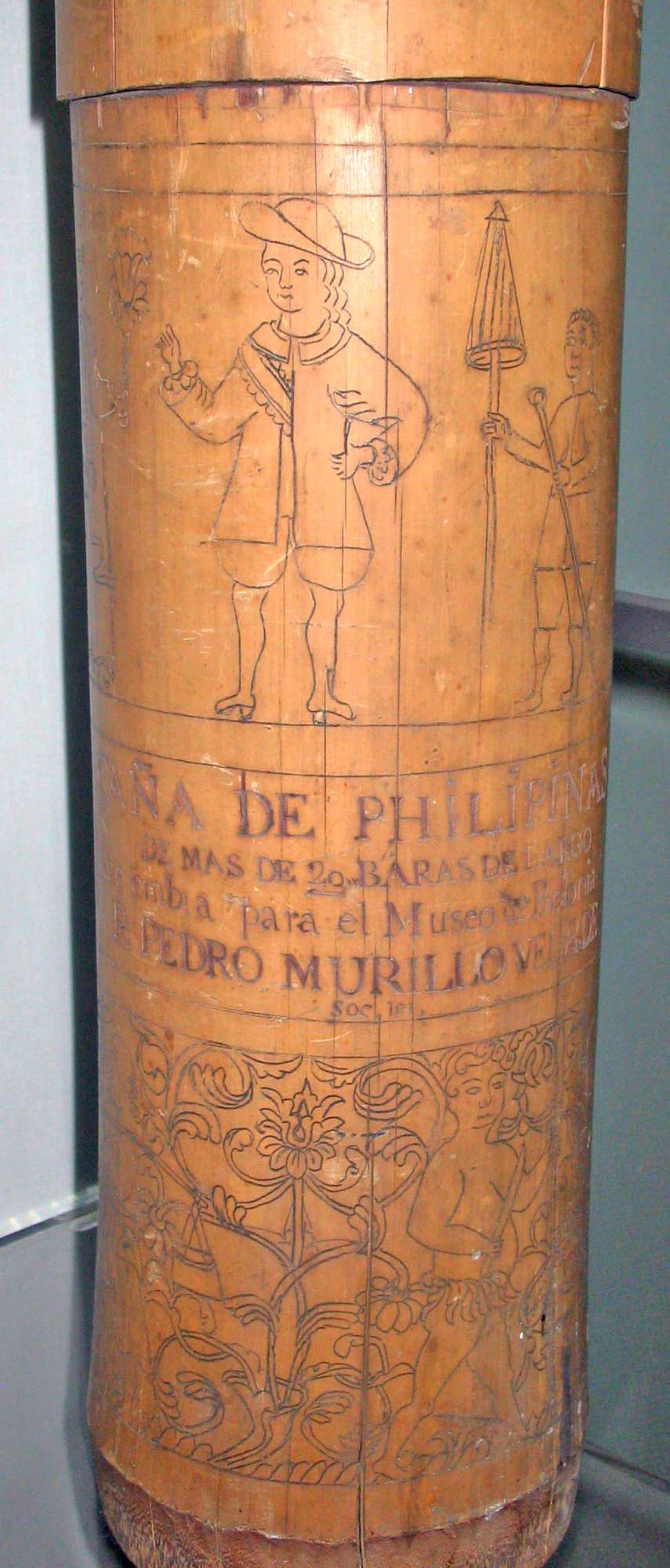 Faretra o astuccio in canna di bambù con coperchio (dello stesso materiale) ad incastro sulla canna sottostante. L'interno è grezzo. La superficie esterna è decorata con disegni pirografati e a china.