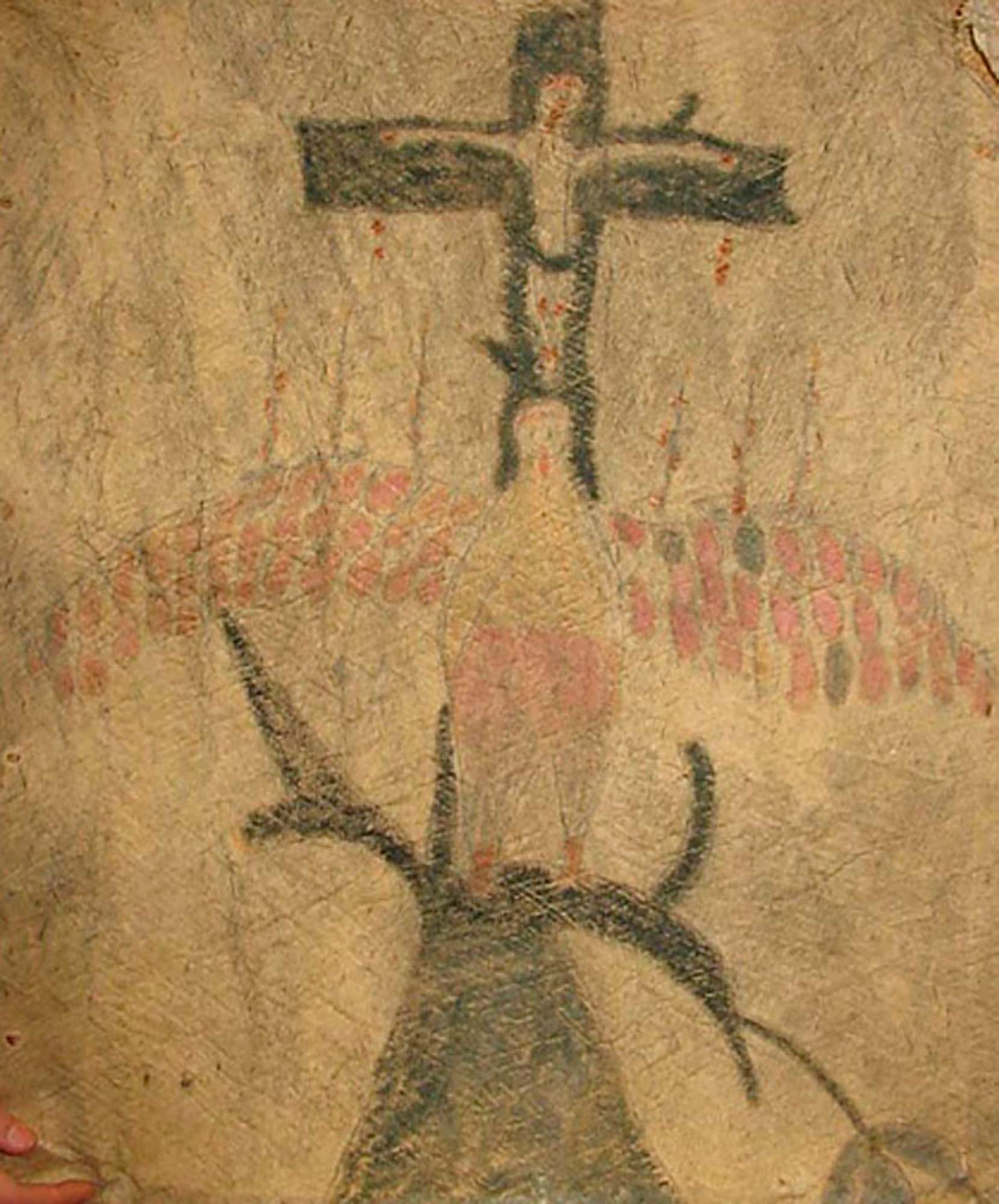 La raffigurazione presenta una caratteristica particolare: la croce sulla quale è posto Gesù si origina da un grande albero nero e ai piedi della croce, posato sullo stesso albero si trova un grosso uccello colorato ad ali spiegate.