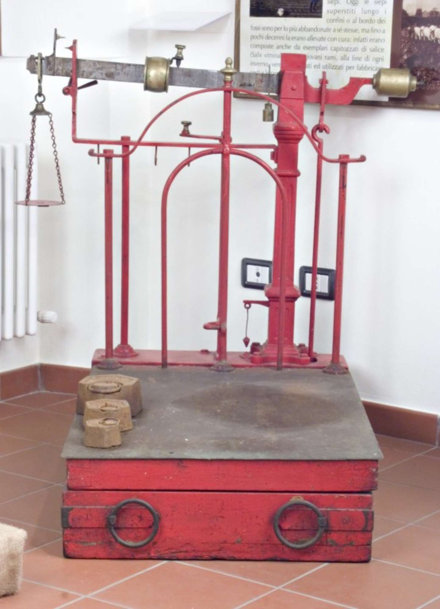 Bilancia per merci molto pesanti dotata di ampio piano di carico e sbarra graduata fornita di un piatto per appoggiare pesi. Verniciata di rosso.