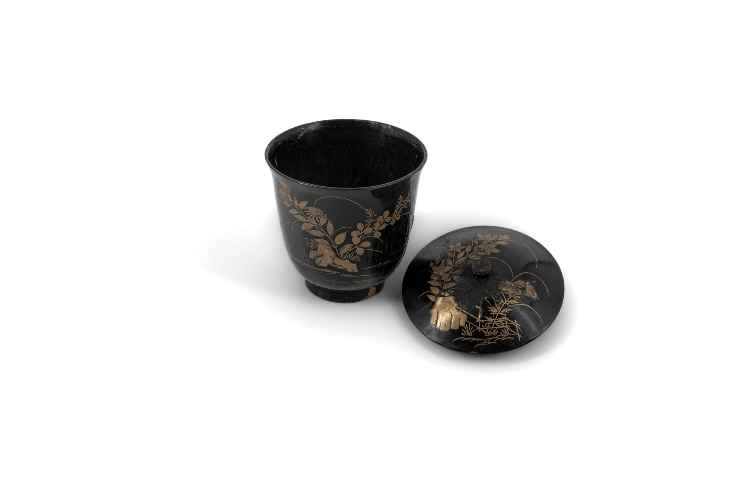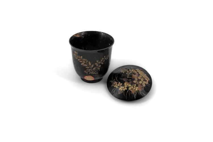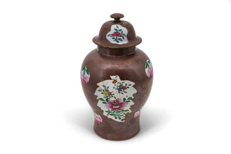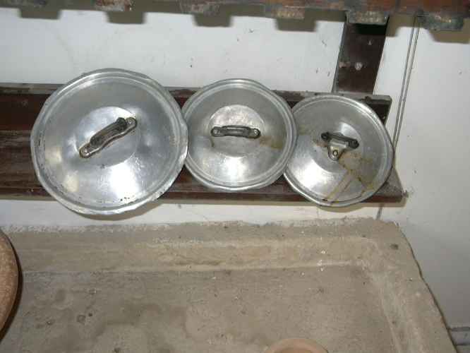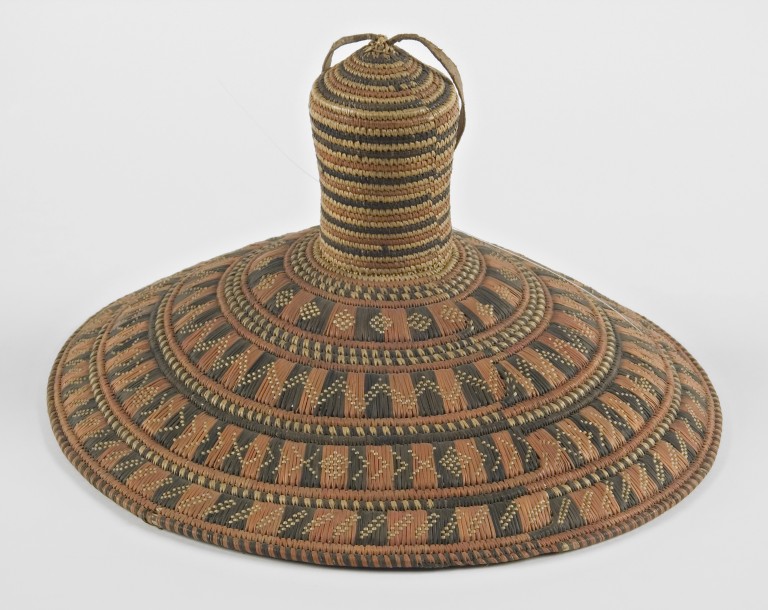 Coperchio in fibre vegetali policrome intrecciate. Il manico, che contiene sonaglini e ha una protuberanza superiore a cui è cucita una nappa di cuoio chiusa ad anello, è avvolto da paglie policrome (giallo, rosso, nero) che si alternano a formare lo sfondo per la decorazione. Rombi e triangoli gialli ornano le diverse fasce colorate, delimitate da righe rosse o nere.