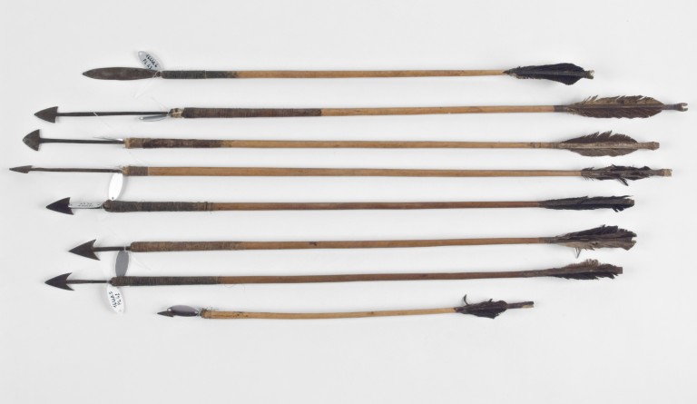 Nove frecce con punta in ferro lavorate secondo la stessa tecnica ma con leggere differenze rispetto alle dimensioni e alla foggia delle cuspidi. L'asta, in legno, è stata levigata fino ad assumere la forma tronco-conica; la parte centrale è assottigliata rispetto le due estremità. L'estremità superiore è rinforzata da tendini di origine animale avvolti strettamente intorno all'asta e ricoperti di mastice. Nella parte inferiore è incisa la cocca e a corta distanza comincia l'impennatura, composta da un avvolgimento di fibre animale applicate con il mastice, su cui sono attaccate quattro metà di penne dai colori marrone e bianco con le barbe arrotondate, disposte radialmente per stabilizzare la traiettoria del tiro.La punta, in ferro, è formata da un'asticciola inserita nell'asta che si allarga per divenire cuspide.Le cuspidi(16440/6) elittica, freccia da caccia.(16440/5/7/12) alette a coda di rondine. (16440/8/9/10/11) forma triangolare.