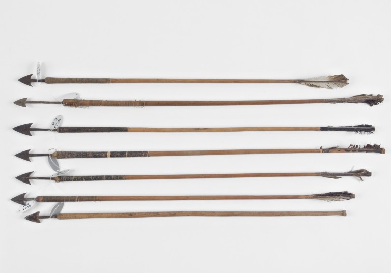 Sette frecce con punta in ferro lavorate secondo la stessa tecnica ma con leggere differenze rispetto alle dimensioni. L'asta, in legno, è stata levigata fino ad assumere forma a sezione circolare. L'estremità superiore è rinforzata da tendini di origine animale avvolti strettamente intorno all'asta e ricoperti di mastice. Nella parte inferiore è incisa la cocca e a corta distanza comincia l'impennatura, composta da un avvolgimento di fibre animale applicate con il mastice, su cui sono attaccate quattro metà di penne dai colori nero e bianco con le barbe arrotondate, disposte radialmente per stabilizzare la traiettoria del tiro.La punta, in ferro, è formata da un'asticciola inserita nell'asta che si allarga per divenire cuspide. Tutte le frecce di questa serie presentano una cuspide di forma triangolare con alette a coda di rondine.