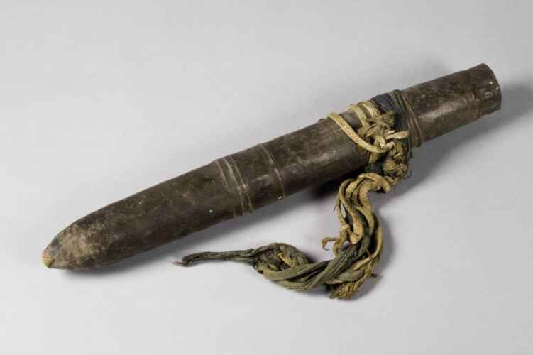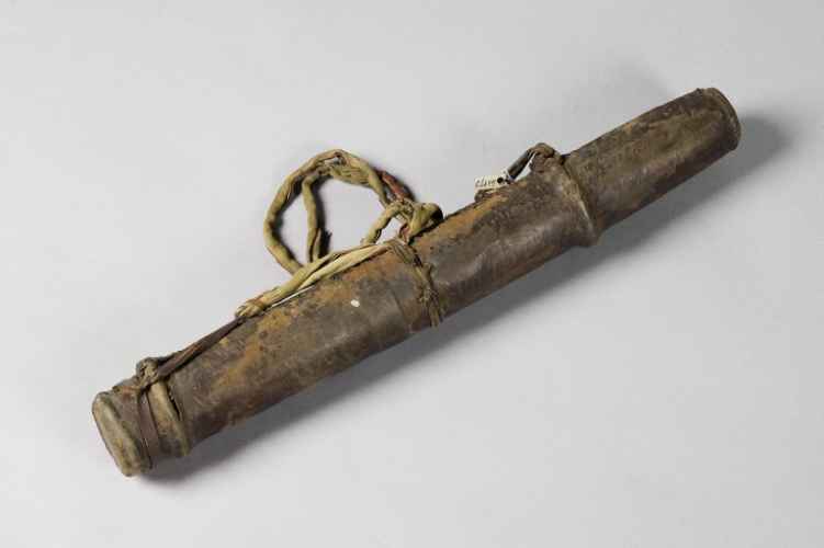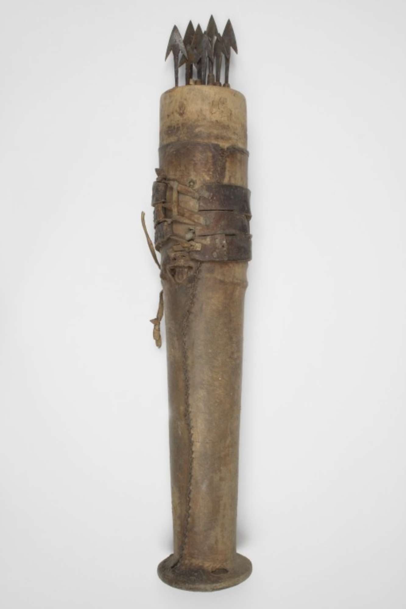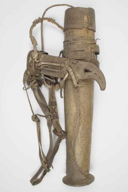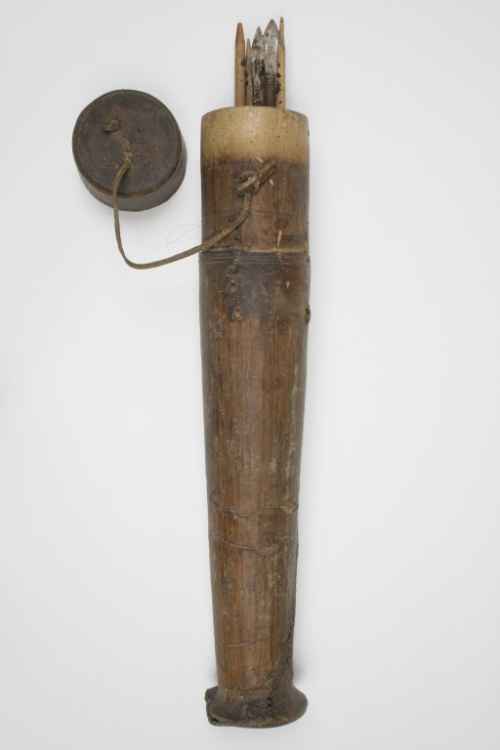 Turcasso per frecce privo di chiusura contenente undici frecce di cui otto con punta in metallo e tre completamente in legno intagliato.