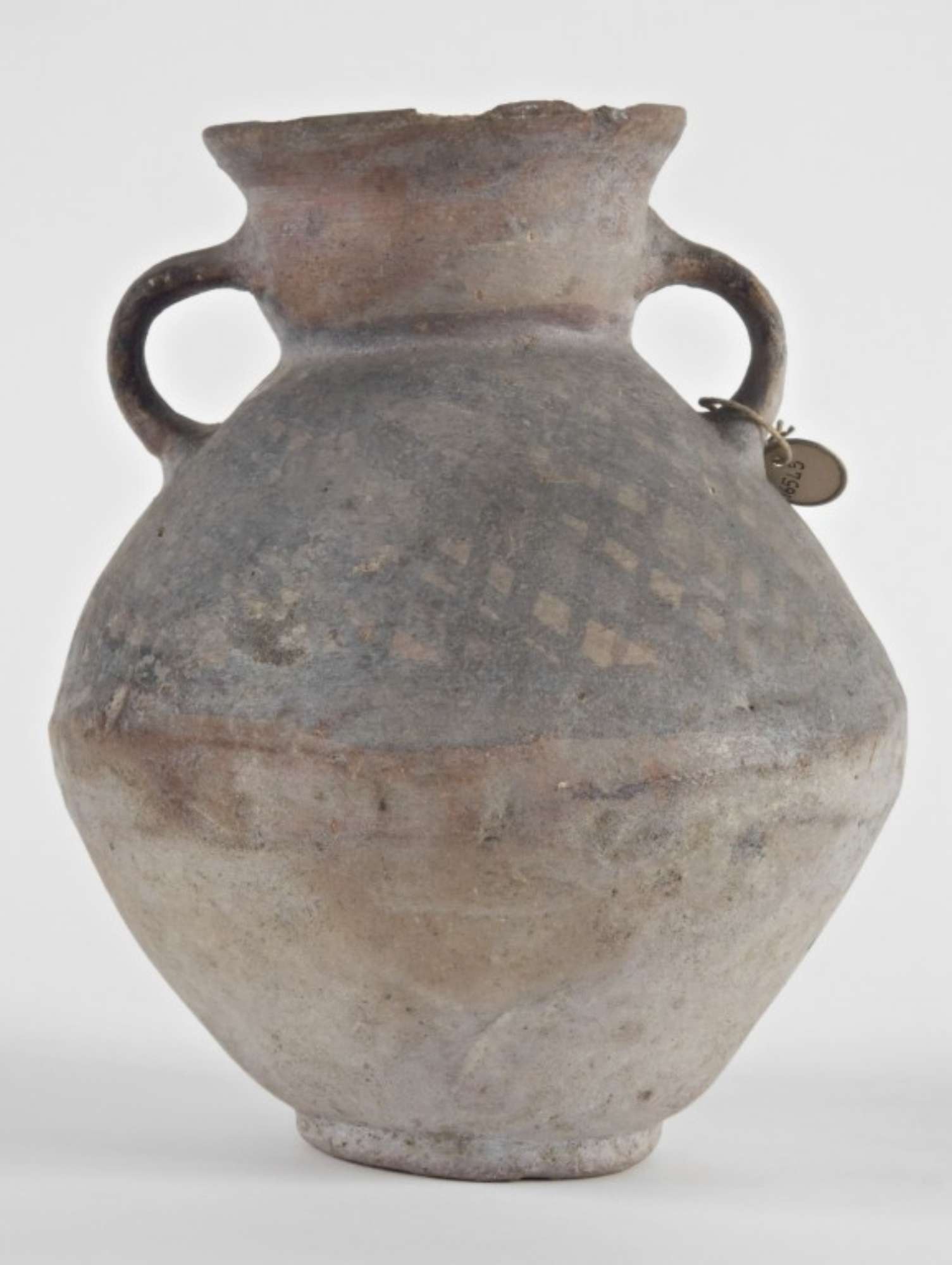 Recipiente chiuso a doppio tronco di cono in impasto di terracotta nerastra e ingobbio bianco. Il collo, di forma globulare e svasata all'orlo, è strozzato sotto il bordo. La base è piana e presenta un supporto anulare. Due anse piatte e simmetriche disposte ai lati uniscono spalla e collo.