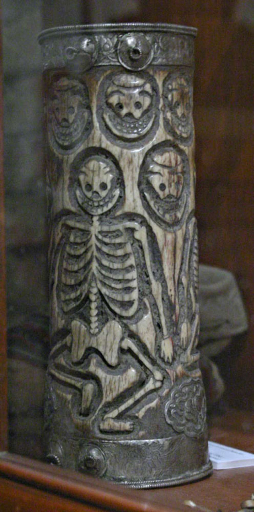 Contenitore tumba per bevanda ciang (birra), o forse per la sua versione distillata, l'arak. La decorazione, a scheletri, funge ironicamente da memento al bevitore immoderato.