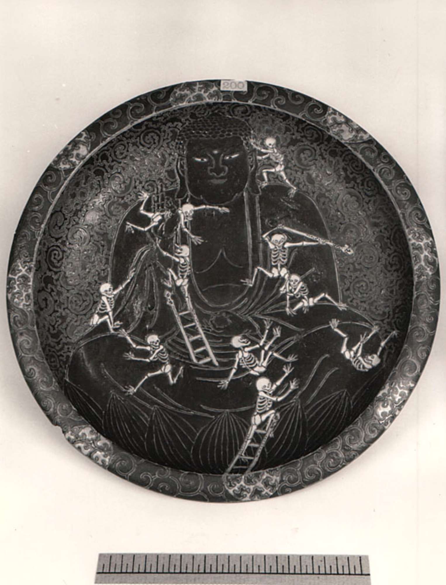 Oggetto acquisito tra il 1884 e il 1885.La scena è una confluenza molto affascinante di diversi generi dell'arte giapponese.Innanzitutto il buddha rappresentato è con tutta probabilità una statua, e non il Buddha vivente; in ogni caso le mani dell'Illuminato propongono l'abhayamudrā, il gesto del "non avere paura".La scena raffigurata si rifà all'alveo delle storie di fantasmi (anche il grande Hokusai si cimentò nel genere in alcune sue xilografie), miscelandole con il filone delle leggende grottesche e caricaturali in ambito buddhista, da cui il ceramografo ha importato la disinvoltura del tratto (cf. Shigisan engi emaki [Leggenda dell'origine del monte Shigi], tre rotoli, colore su carta, h 31 cm, metà del XII secolo, tardo periodo Heian, proprietà del tempio Chōgosonshiji di Nara).Il risultato? Una banda di scheletri infesta la Sala d'Oro di un convento buddhista, dove la statua del Buddha era esposta, anzi prendono proprio d'assedio Śakyamuni, con tanto di scale, mentre l'Illuminato intima allo spettatore (e forse anche ai monaci, accorsi per verificare il motivo di tanto schiamazzo nella Sala) di non farsi fuorviare dalle apparenze: gli orrendi scheletri, e quindi anche la Morte, sono realtà impermanenti.La scena risulta quindi come una sapida parodia di un episodio famoso della vita del buddha storico, Śakyamuni, quando venne interrotto durante la meditazione che l'avrebbe condotto alla bodhi, l'illuminazione definitiva, da parte del dio Mara – "Morte", appunto. Questi, preoccupato che il Buddha potesse condividere il proprio insegnamento con il resto dell'umanità, gli scagliò contro, a mo' di distrazione, le sue tre stupende figlie: costoro non ressero la taglientissima critica del Buddha – "Voi non siete che sacchi di carne repleti di ossa" e si disfecero prima in vecchie laide, poi in scheletri ed infine in polvere (come del resto tutti siamo destinati a finire) sotto gli occhi impotenti del padre.È simile in formato al pezzo 199, un piatto in porcellana che invece raffigura Idaten (dio della guerra), Kannon (buddha della misericordia) e un demone.