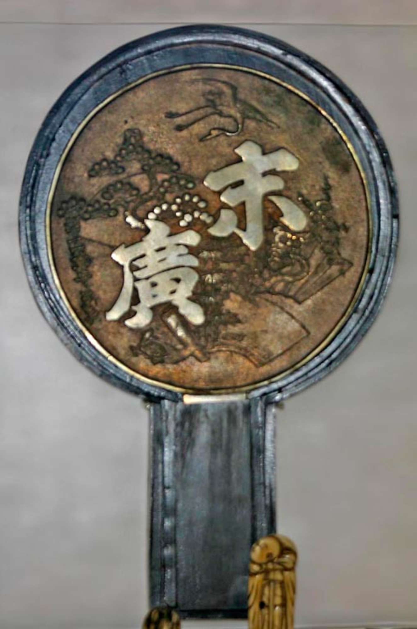 Specchio con contenitore in legno laccato con la tecnica detta nashiji: con un cannello di bambù si soffia lamina d'oro triturata su lacca ancora umida.Sul verso sono raffigurati un airone in volo, fiori di ciliegio, un bambù, un pino e una tartaruga. Ciliegio, pino e bambù sono parzialmente iscritti in cartigli. È un coacervo di simboli benaugurali cinesi, convergenti verso un augurio di una vita lunga e proba, coronata dall'arrivo di una vasta prole.In alto a destra campeggia il carattere mo, "la fine, la quintessenza"; in basso a sinistra troneggia il carattere guang, "vasto".