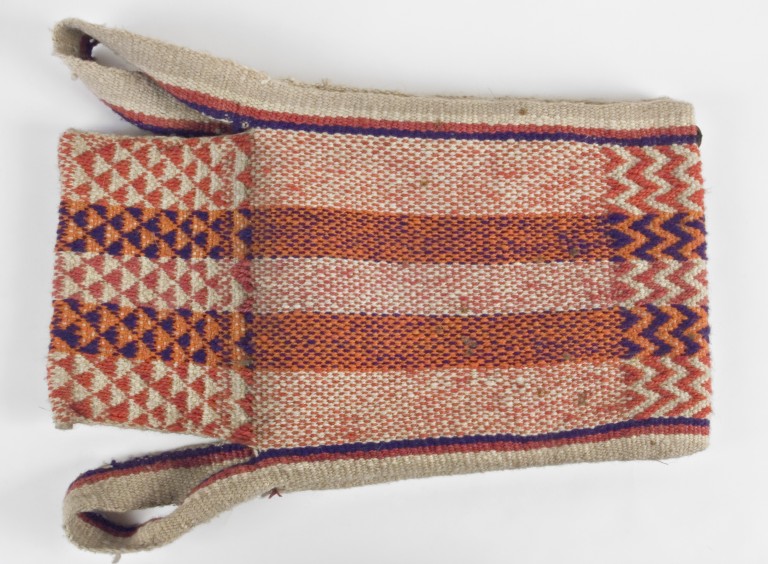 Coppia di bisacce di forma rettangolare con risvolto esterno a coprire le tasche, unite tra loro da due manici utilizzati per il trasporto. La tessitura è originata da un unico pezzo di lana di lama in diversi colori naturali: viola, bianco, rosso e arancio. L'intreccio dei colori è utilizzato per decorare le bisacce.