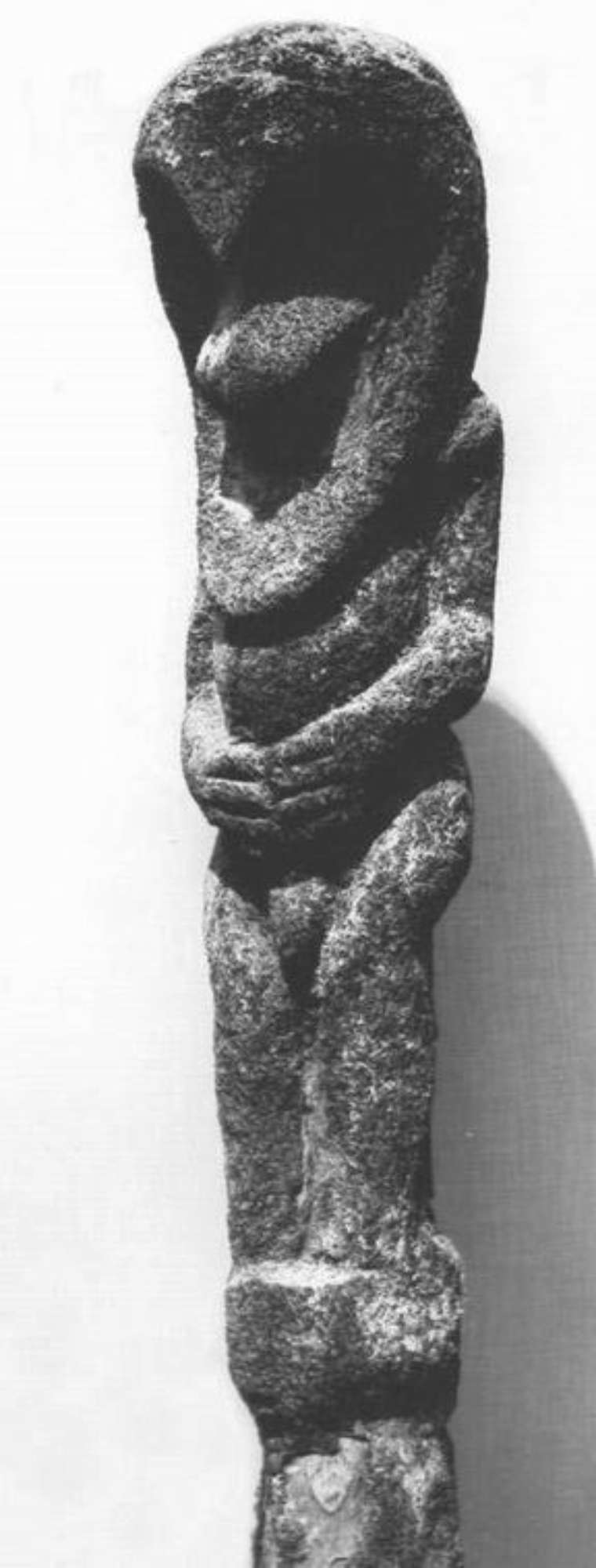 Grande scultura in felce arborea, raffigurante un personaggio femminile con braccia raccolte sul ventre e con seni accentuati. Le gambe sono leggermente flesse. Tutta la parte del viso è stata scavata risparmiando un appendice che ricade fra gli occhi e un naso marcatamente pronunciato. Anche il mento risulta notevolmente pronunciato.
