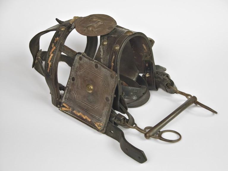 Briglia composta da testiera, frontale, paraocchi, sottogola, capezzina con piastra decorativa e morso a cannone rigido (#morso francesino#) fornito di guide per variarne la lunghezza. La presenza dei paraocchi indicano che il finimento veniva impiegato per cavalli da attaccare (a carri o a vetture da traino). Il tipo di materiali impiegati per la realizzazione del pezzo e gli elementi decorativi, come le borchie in ottone e il medaglione in rame sbalzato, raffigurante un cavallo bardato al trotto visto di profilo, evidenziano la raffinatezza del finimento, rendendolo adatto al tiro del calesse.Fonti di documentazione 3/4