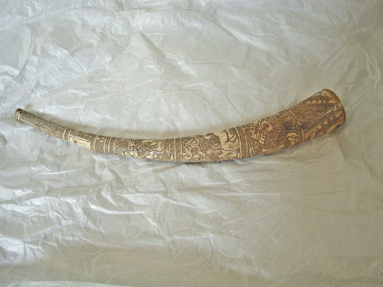Corno in avorio con decorazioni a bassorilievo raffiguranti scene di caccia di iconografia europea. L'imboccatura è laterale.