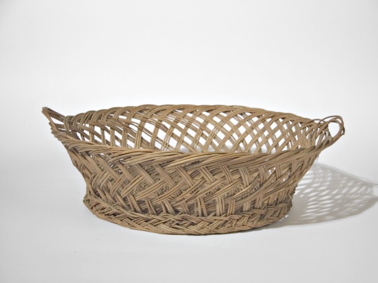 Struttura troncoconica, leggermente svasata, con la parte ampia rivolta verso l'alto; base circolare, intreccio ai lati piuttosto rado, costituito da striscie di tre sottili rami paralleli che ricadono a U rovesciata formando il bordo; manici costituiti da due striscie sporgenti simmetriche e opposte.
