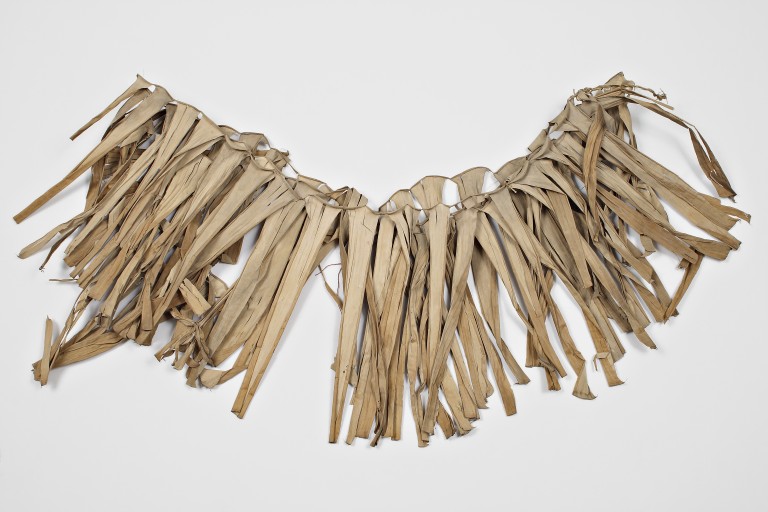Gonnellino di fibre vegetali caratterizzato da una serie di 5 file di foglie seccate. Da ogni foglia sono state ottenute delle foglie di forma approssimativamente rettangolare, avvolte su se stesse dal lato del bordo. Alle due estremità laterali, ogni fila di frange finisce con un filamento. Tutti i filamenti sono poi stati avvolti fra loro ottenendo un cordino per lato che doveva servire per legare il gonnellino alla vita.