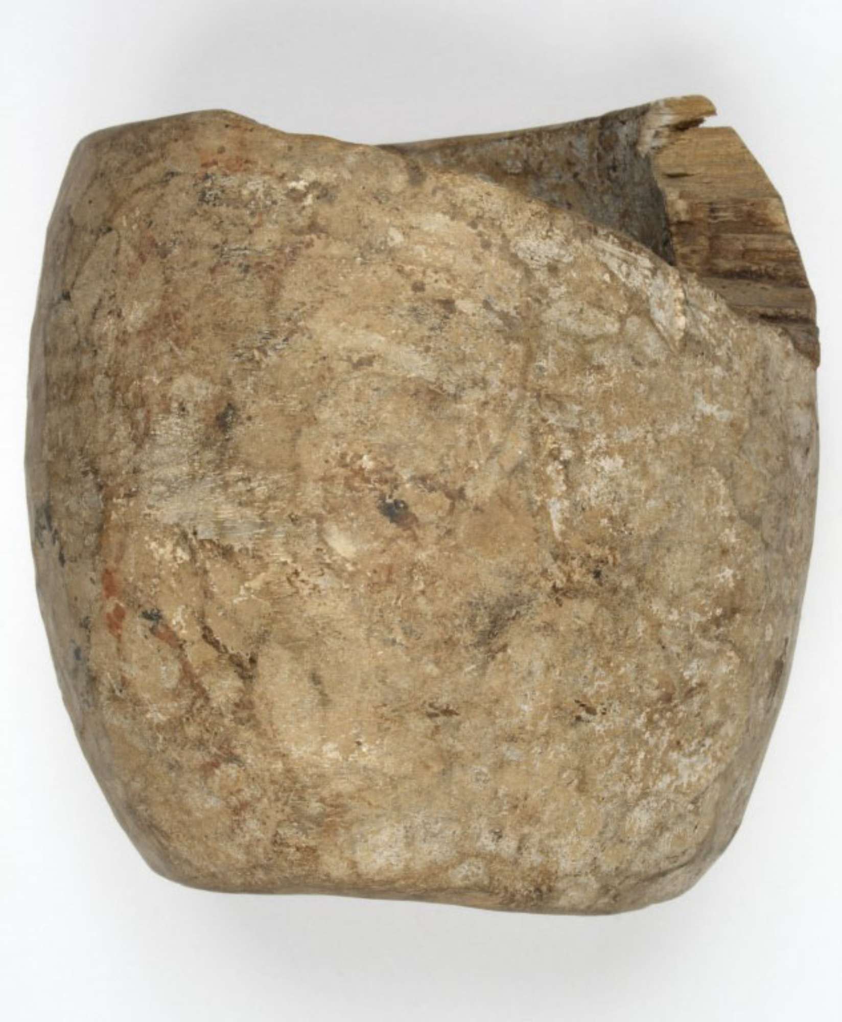 Coppa in legno chiaro intagliato, priva di decorazioni, con etichetta cartacea applicata con un piccolo chiodo fissato all'esterno.