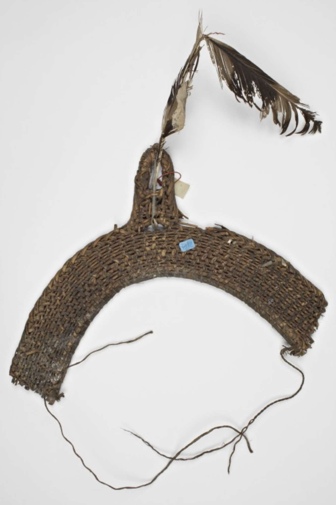 L'oggetto è a forma di semiluna con una cuspide a U rovesciata al centro. E' realizzato con un intreccio di porzioni di cannucce o piccoli bastoncelli, che formano l'intelaiatura, e fibre vegetali che la completano. Alle due estremità vi sono dei cordini per legare l'ornamento. Al centro della cuspide è fissata una piuma piuttosto compromessa. Dovevano essercene altre o almeno si intravedono i resti di altri due calami.