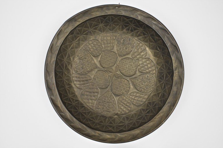 Piatto in ottone riccamente decorato a sbalzo e punzone con motivi floreali e geometrici.