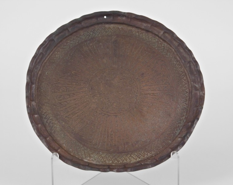 Piatto o vassoio circolare decorativo, con orlo frastagliato e in rilievo. Sulla superficie interna presenta incisioni molto ravvicinate e fitte.