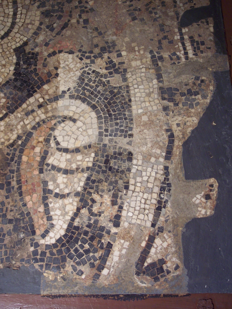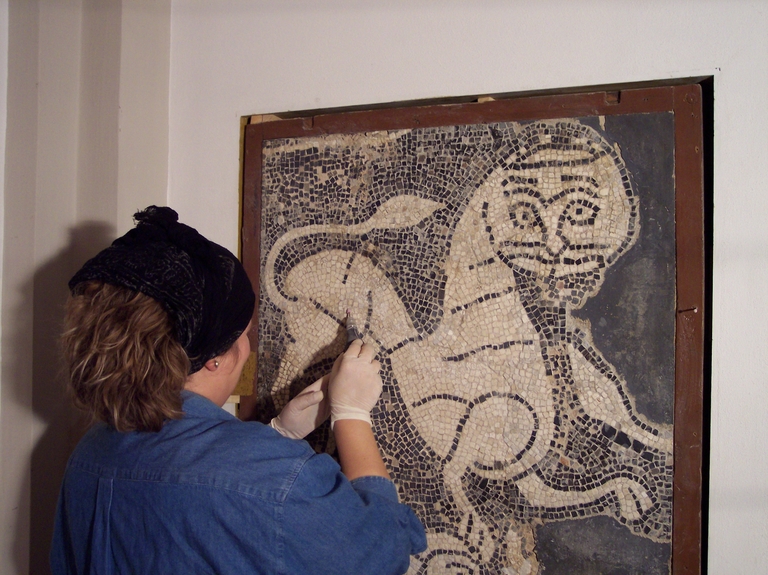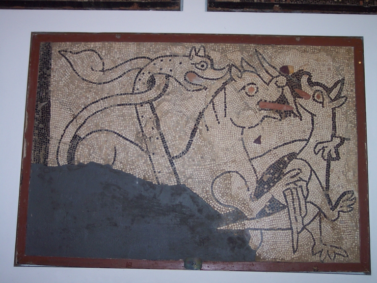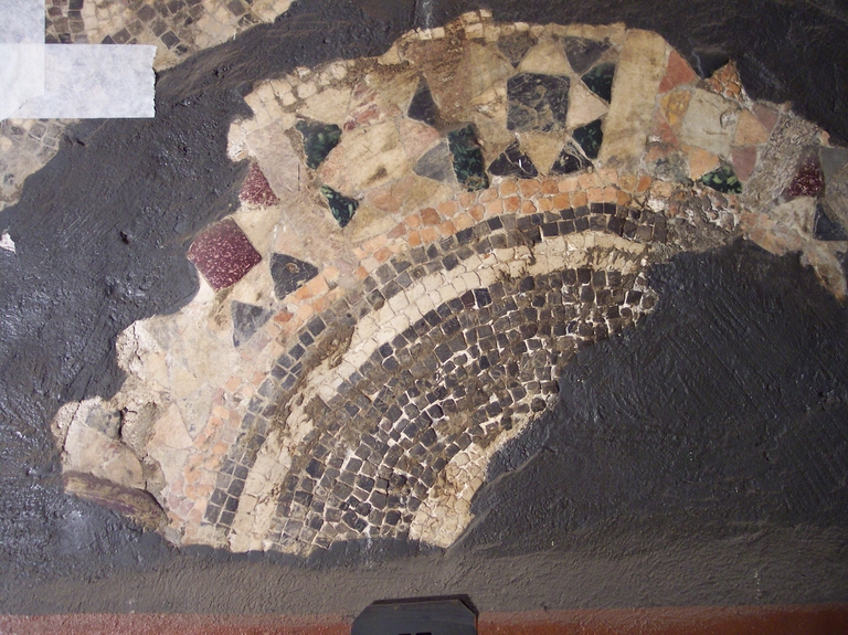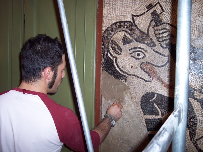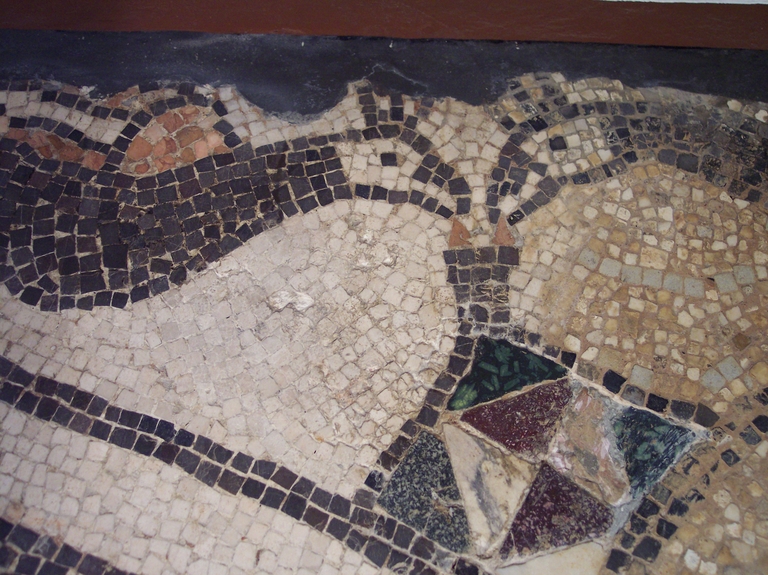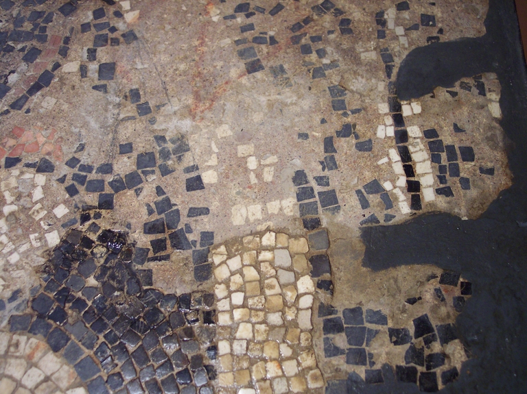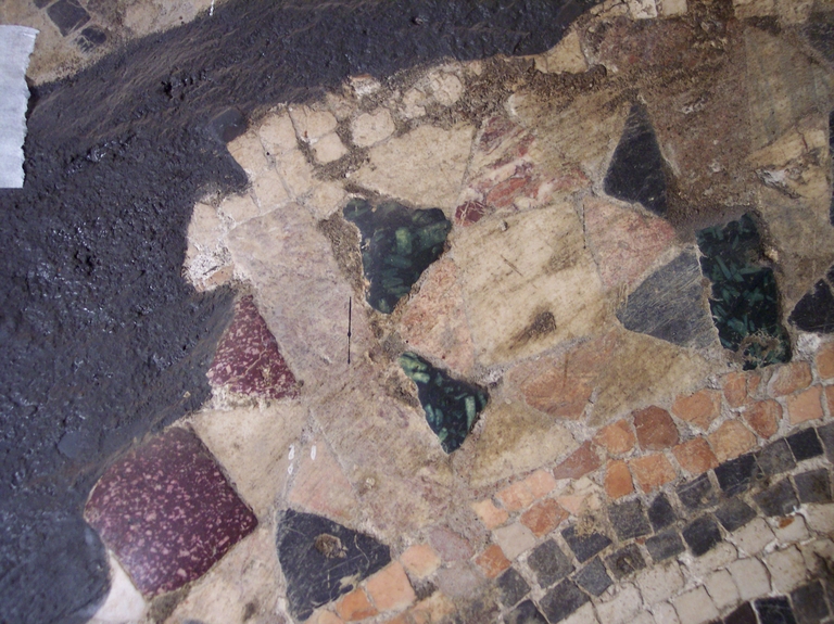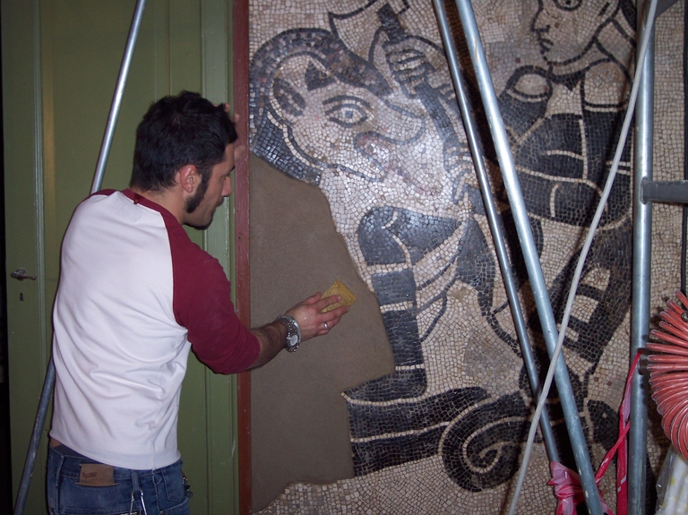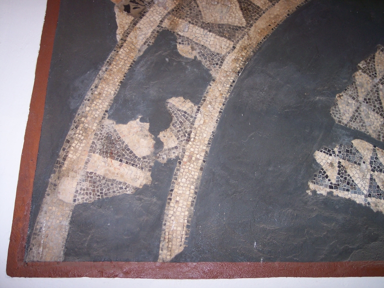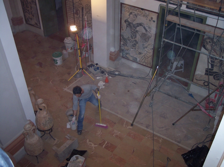 •Integrazione delle lacune dei tessellati con malta di calce aerea addizionata di polveri di marmo colorate, con l’aggiunta di una piccola percentuale di resina acril33; concordato con la DL che l’aspetto finale fosse finalizzato a conservare l’effetto estetico della esposizione ottocentesca. Tolte le vecchie stuccature lucide di colore nero, probabilmente applicate mezzo secolo dopo la prima presentazione, esse sono state sostituite con stuccature sempre di tono piuttosto scuro ma di aspetto opaco, non condotte sottolivello come abbiamo fatto per i mosaici della nuova ala romana dello stesso museo, ma portate pari alla superficie del tessellato come le aveva pensate il Chierici.