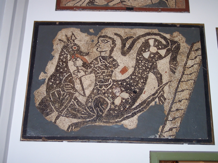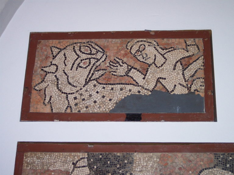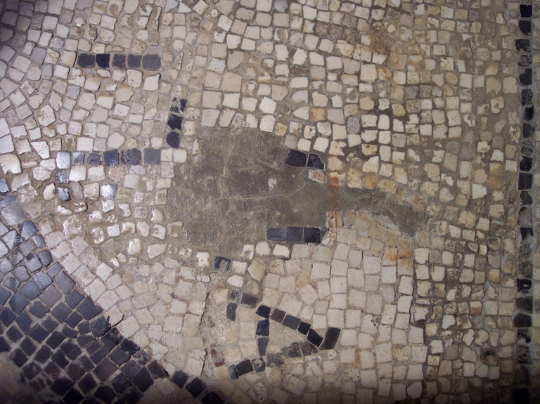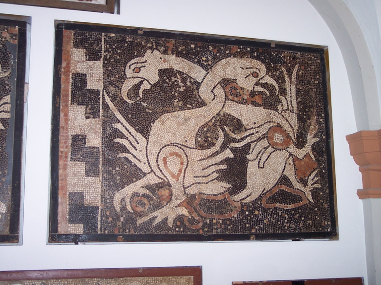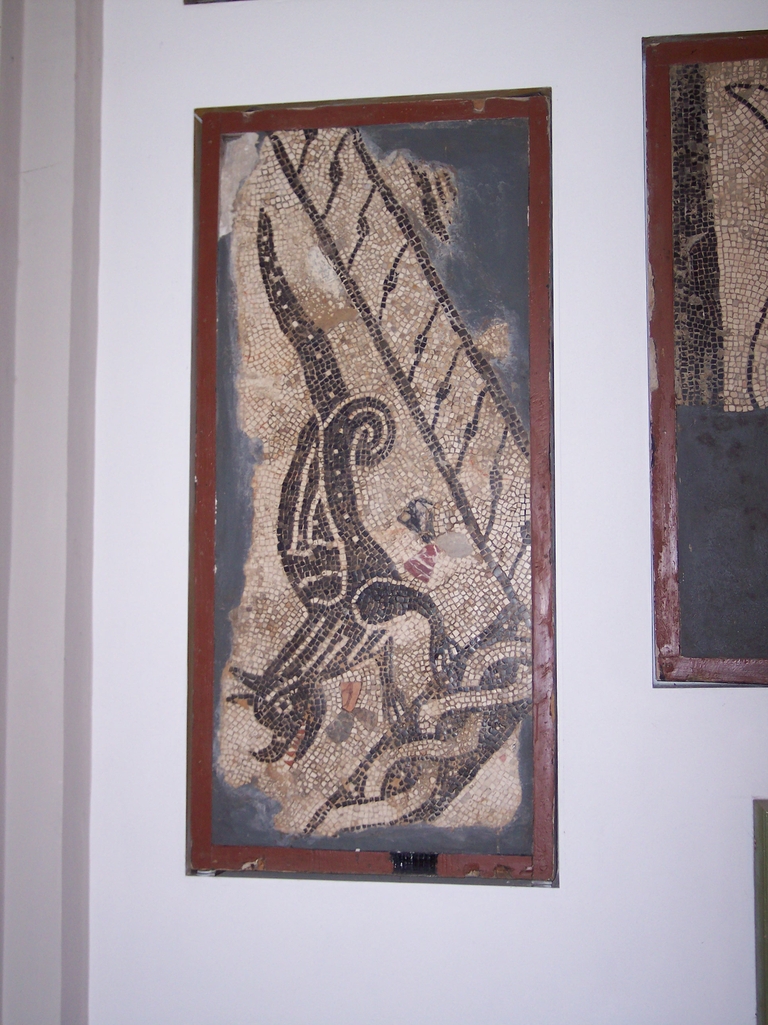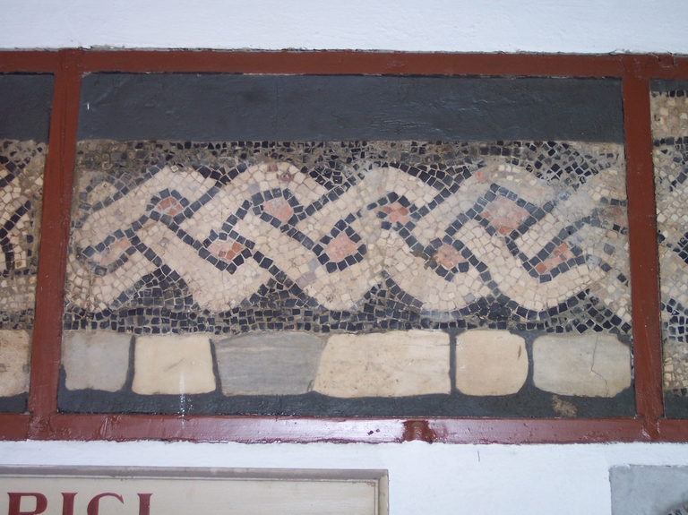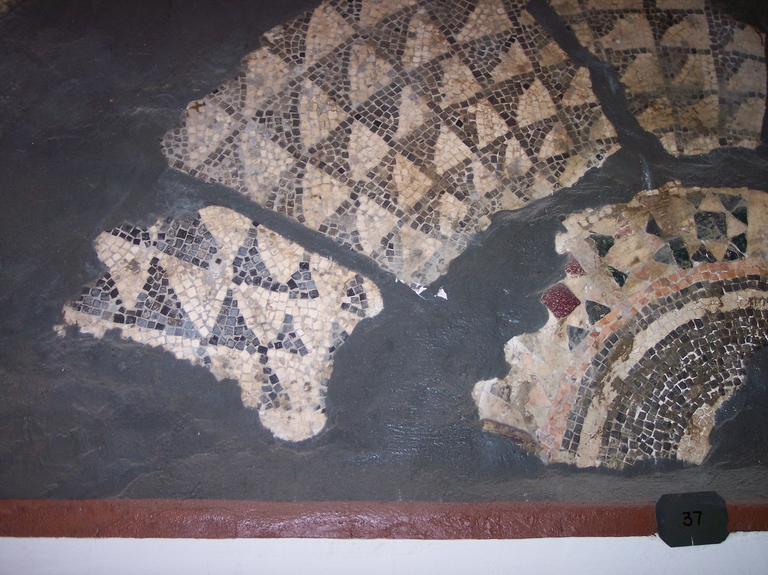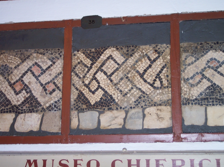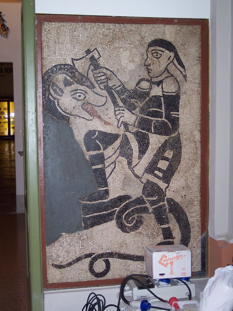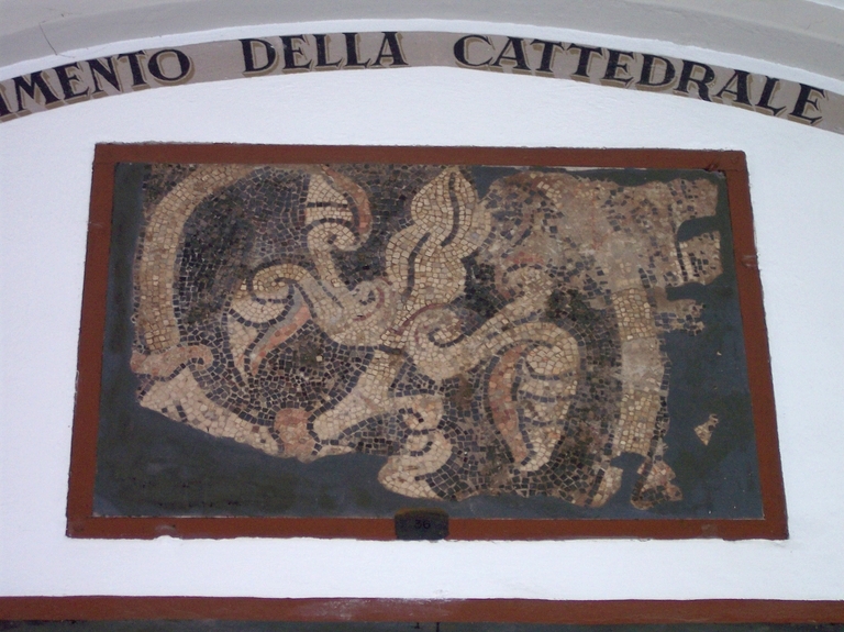 •Integrazione delle lacune dei tessellati con malta di calce aerea addizionata di polveri di marmo colorate, con l’aggiunta di una piccola percentuale di resina acril33; concordato con la DL che l’aspetto finale fosse finalizzato a conservare l’effetto estetico della esposizione ottocentesca. Tolte le vecchie stuccature lucide di colore nero, probabilmente applicate mezzo secolo dopo la prima presentazione, esse sono state sostituite con stuccature sempre di tono piuttosto scuro ma di aspetto opaco, non condotte sottolivello come abbiamo fatto per i mosaici della nuova ala romana dello stesso museo, ma portate pari alla superficie del tessellato come le aveva pensate il Chierici.