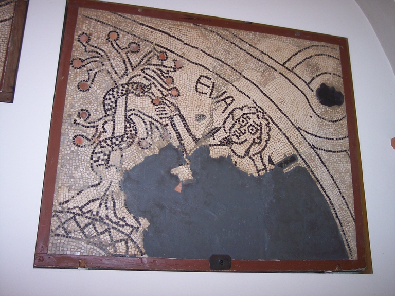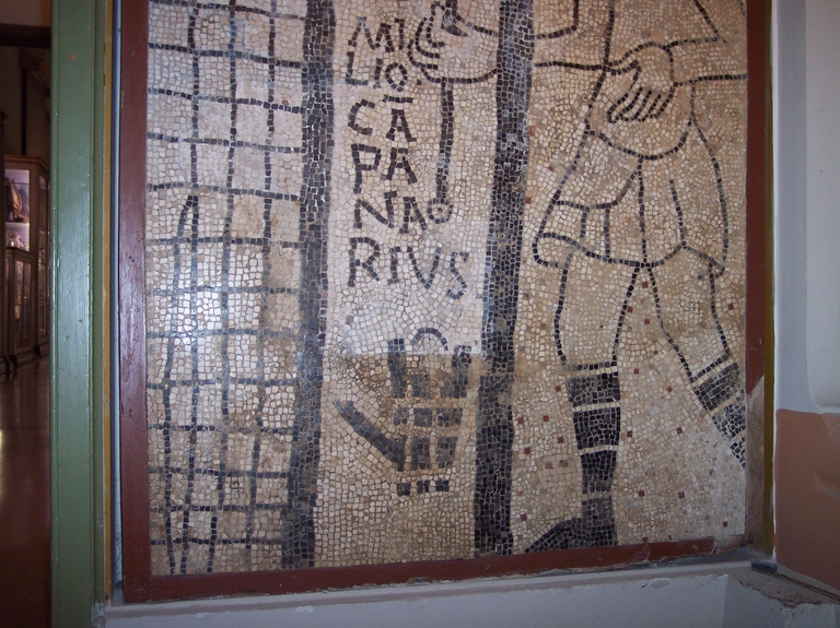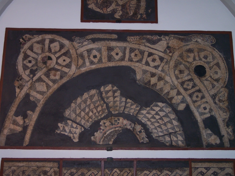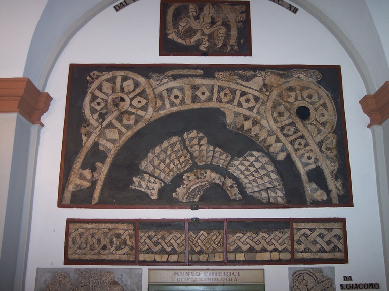 Tutti i mosaici in oggetto sono murati alle pareti d'ingresso del Museo Archeologico. I 22 frammenti musivi sono installati nella parete destra del vestibolo e nella parete sinistra dell'atrio. Questa presentazione era stata realizzata dal fondatore da museo archeologico reggiano don Gaetano Chierici, intorno agli anni '70 del 1800, vede l'installazione di piccole sezionì musive rettangolari prelevate da mosaìci di dimensioni più estese. Queste sezioní sono quasi tutte complete del sottofondo di malta originale. I mosaici sono quindi di dimensioni modeste ma di notevole spessore (attorno ai 15, 20 cm), e sono collocati in casseforme di legno costipando gli interstizi con getti di gesso da presa. Le casseforme sono state inserite nel muro in modo che il tessellato apparisse allo stesso livello della superficie murale.