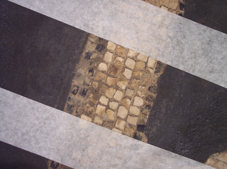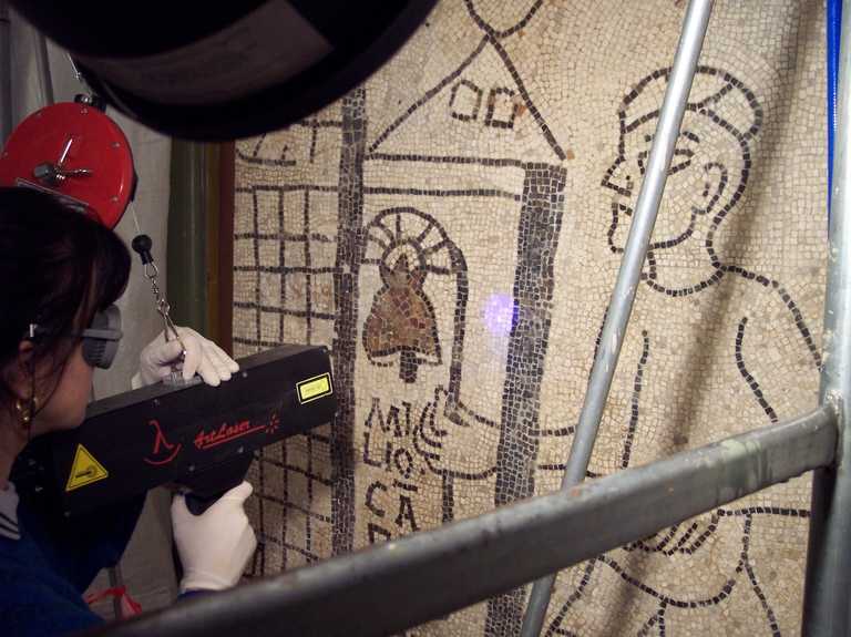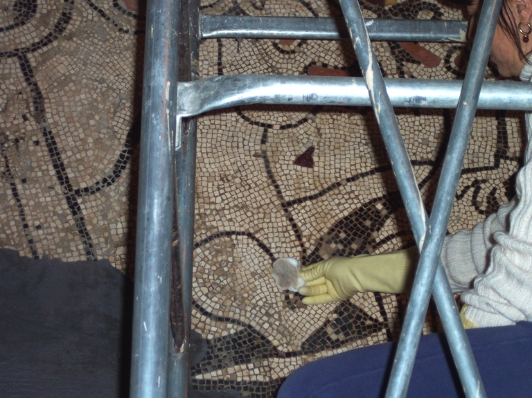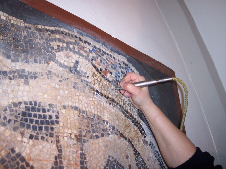 •Esecuzione della operazione di pulitura dei tessellati nella tecnica sopra detta, completata da una accuratissima operazione di rimozione meccanica con bisturi e vibroincisori di stuccature cementizie e vecchie integrazioni alterate.