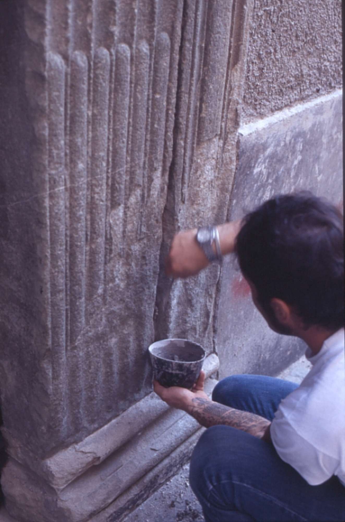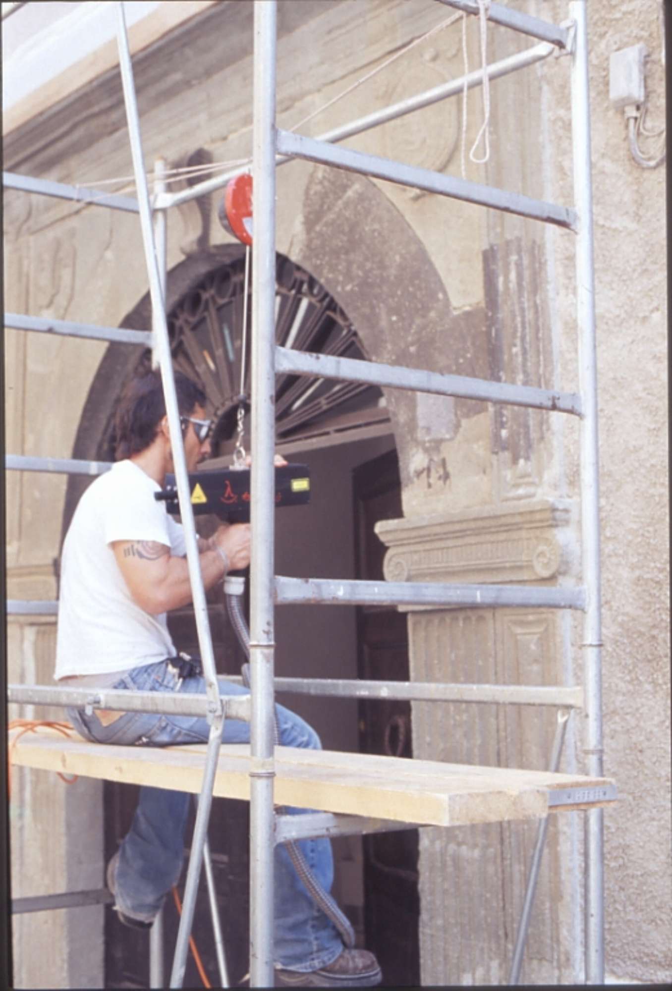 rimozione di alcune stuccature di precedenti interventi e, con microfrese, è stato rimosso lo strato di catrame presente sulla parte bassa di entrambi i portali.