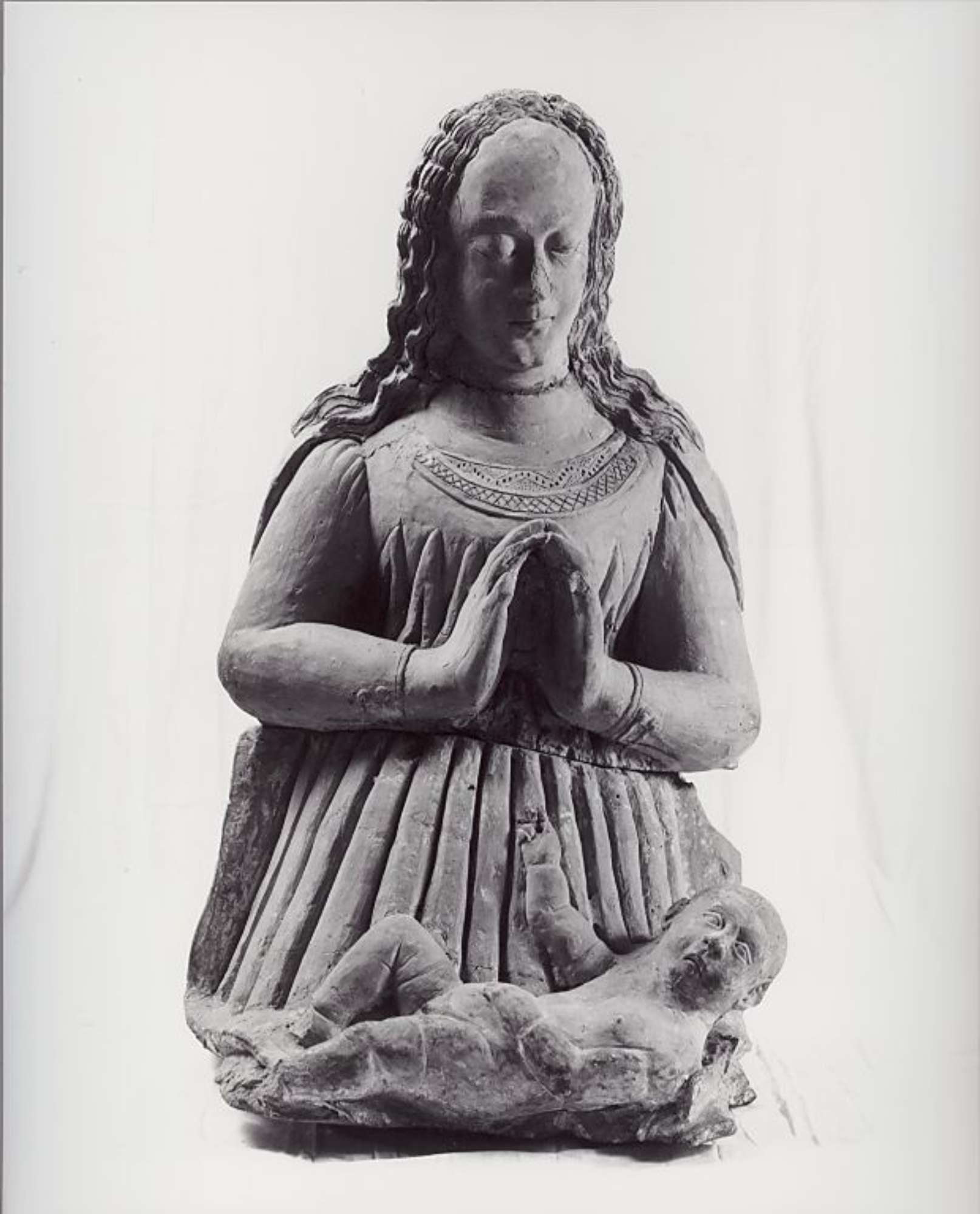 -Scultura: la policromia é mancante. La testa della Madonna é stata incollata e la mano destra é danneggiata come il panneggio in corrispondenza delle due parti di cottura.