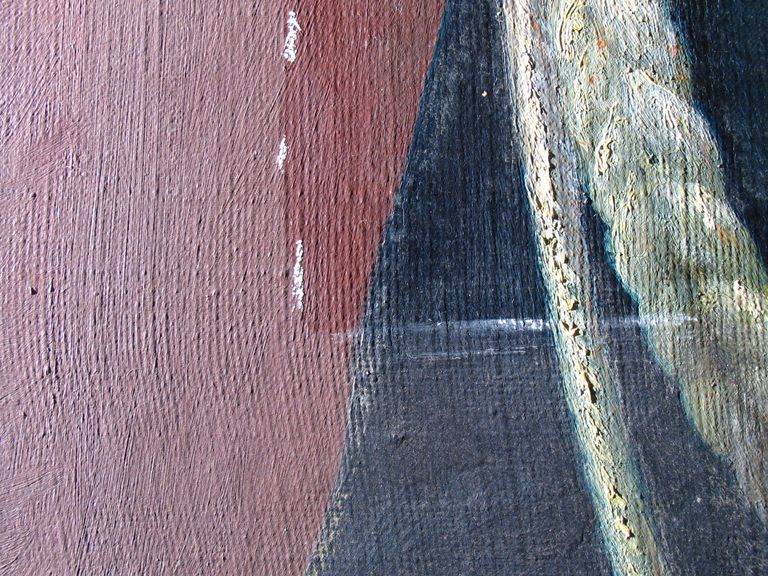 •Smontaggio della tela dal telaio e ripulitura accurata dei depositi di sporco sulla tela ed in particolare di quelli presenti tra tela e telaio, con l’utilizzo di pennelli e aspirapolvere a bassa aspirazione..