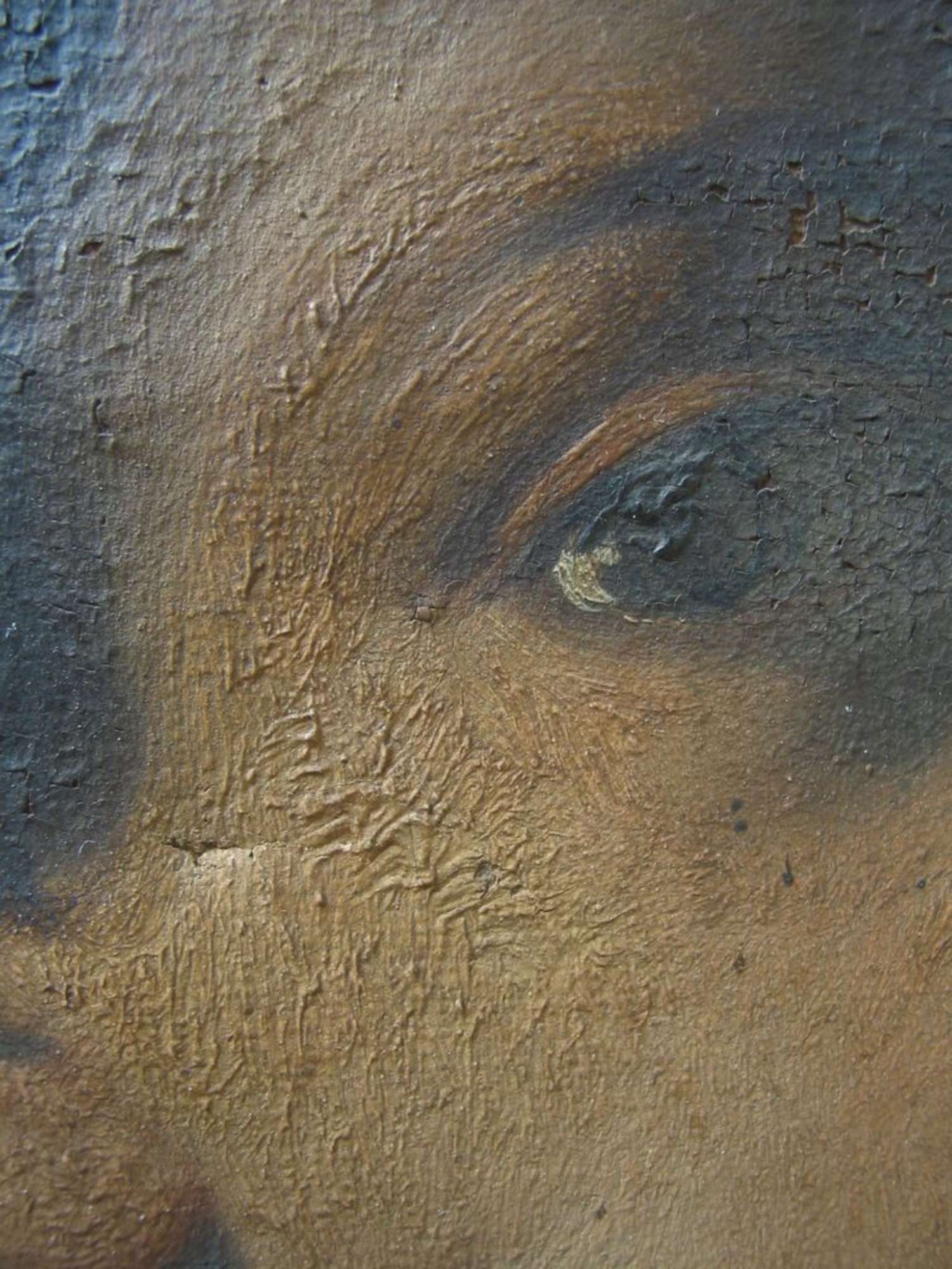 Ad un primo esame eseguito sul dipinto, dopo averlo smontato dalla cornice, si è potuto constatare che l'opera è stata tagliata su due lati e ripiegata sul colore adattandola a questo telaio ed alla cornice non originali. L'opera è in prima tela, ma ha già subito un intervento da restauro (pezza sul bordo laterale di destra) per risarcire un taglio. E' visibile, sempre sul retro, la sagoma del ritratto dovuta alle vernici assorbite dalla tela. I bordi hanno diversi fori che indicano vari montaggi.