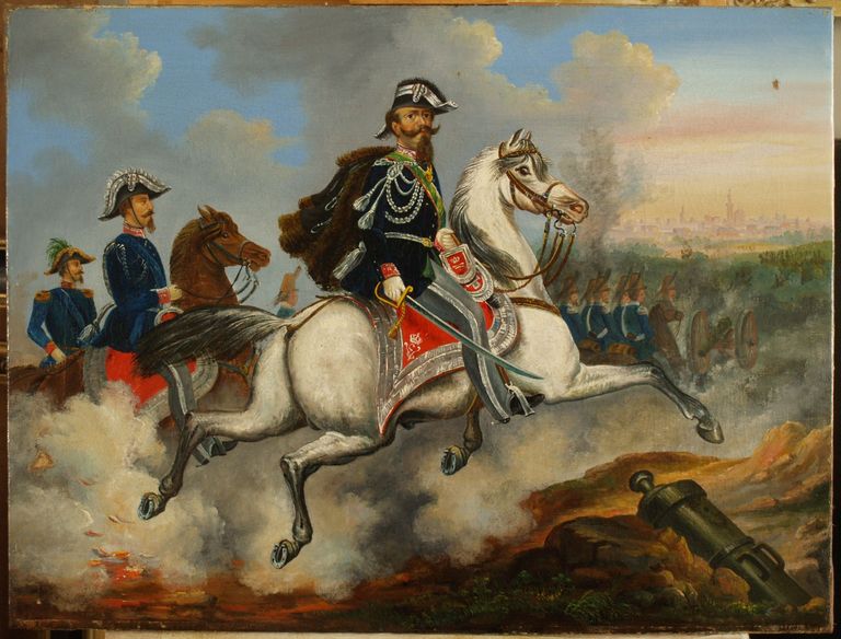 Soggetto: Battaglia di Palestro con ritratto di Vittorio Emanuele II