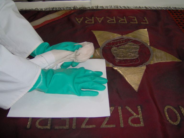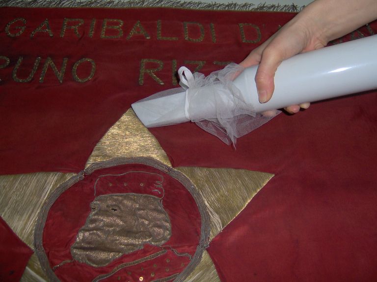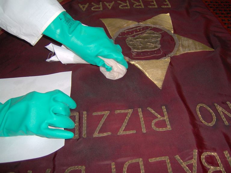 Vaporizzazione e ripetuti riposizionamenti del gagliardetto per reidratare le fibre e recuperare la forma originale dell'oggetto, utilizzando acqua deionizzata;