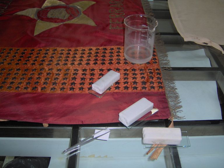 Vaporizzazione e riposizionamento della bandiera per reidratare le fibre e recuperare la forma originale dell'oggetto, utilizzando acqua deionizzata;