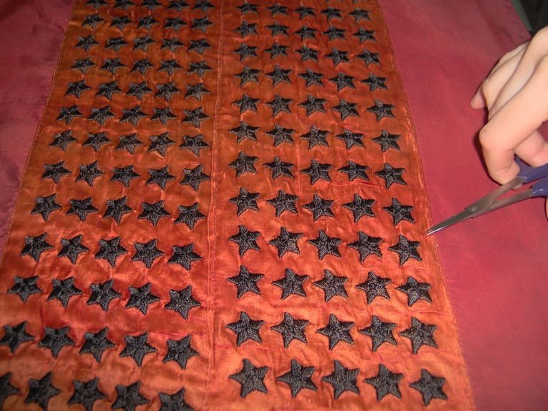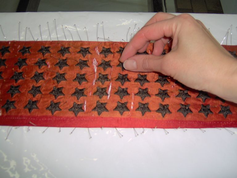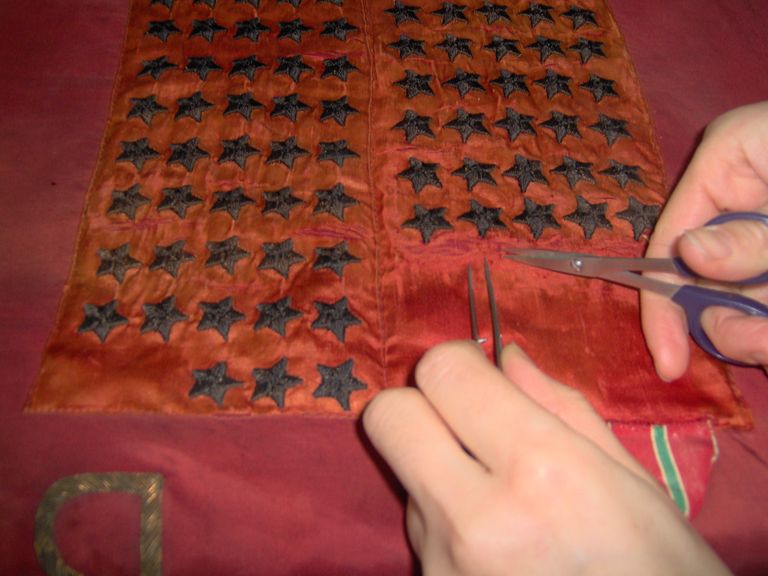 Scucitura delle due fasce in raso arancione per permettere il loro successivo consolidamento ad ago; Test sulla stabilità dei colori per un eventuale lavaggio a secco;