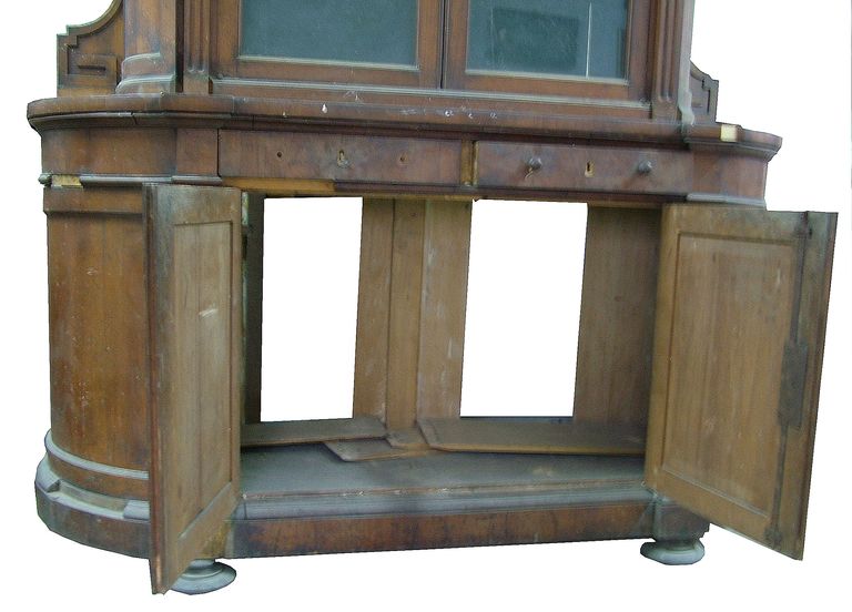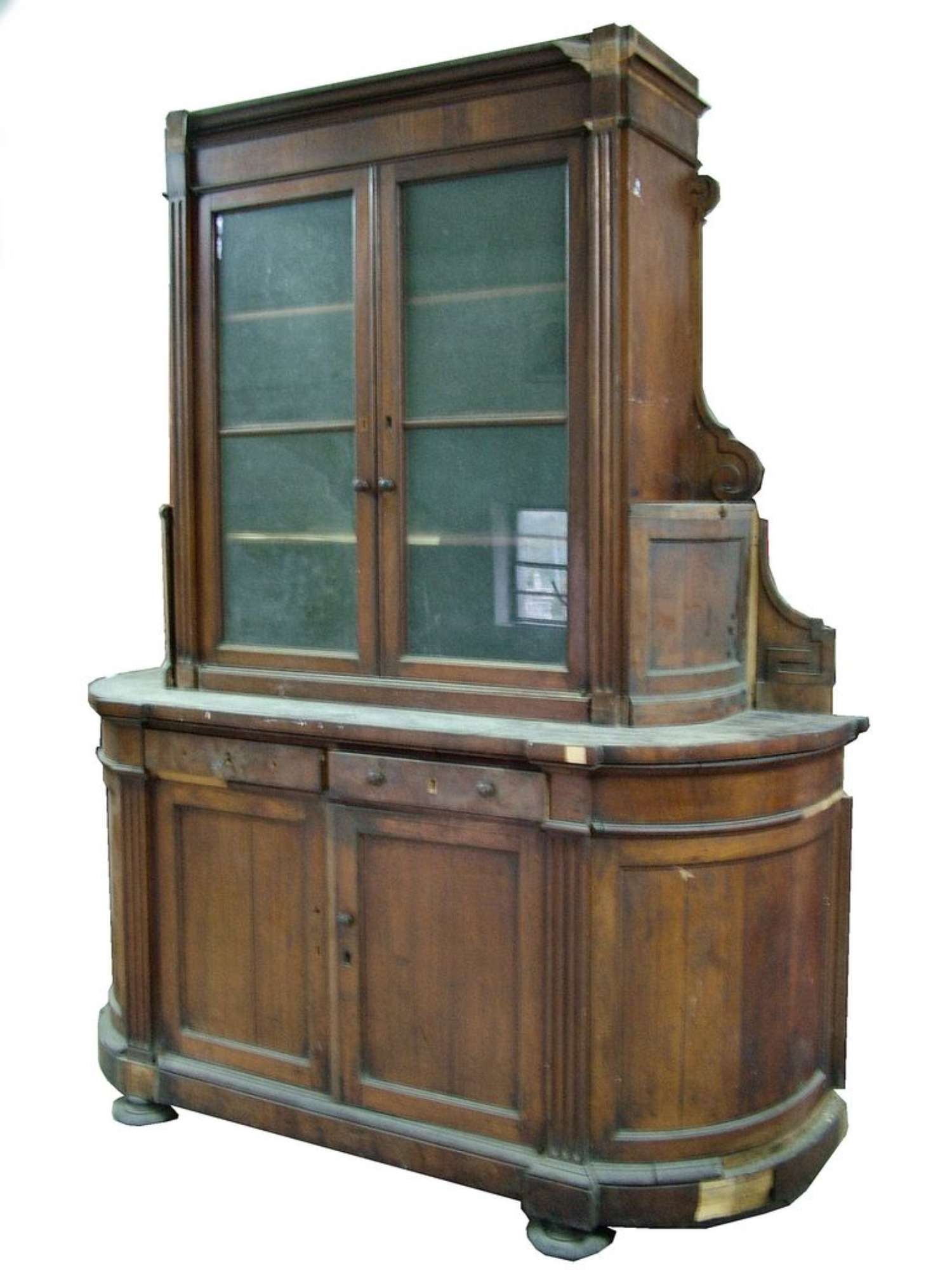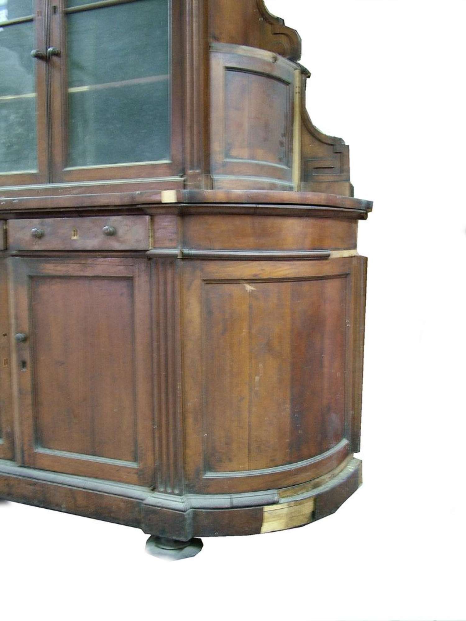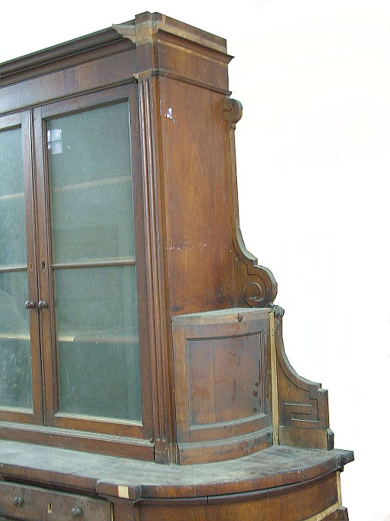 L'aspetto estetico generale era notevolmente alterato da stratificazioni di sporcizia che impedivano una visione dei toni di colore del ciliegio più luminosi e caldi, come evidenziato dalle parti meno in vista e non particolarmente intaccate dall'accumulo di sostanze inquinanti. La struttura, seppur pesante e robusta, era particolarmente debole negli incastri che risultavano sconnessi e scollati. Interamente lastronata l'opera presentava molte fessurazioni e distacchi e perdita di lastronatura.