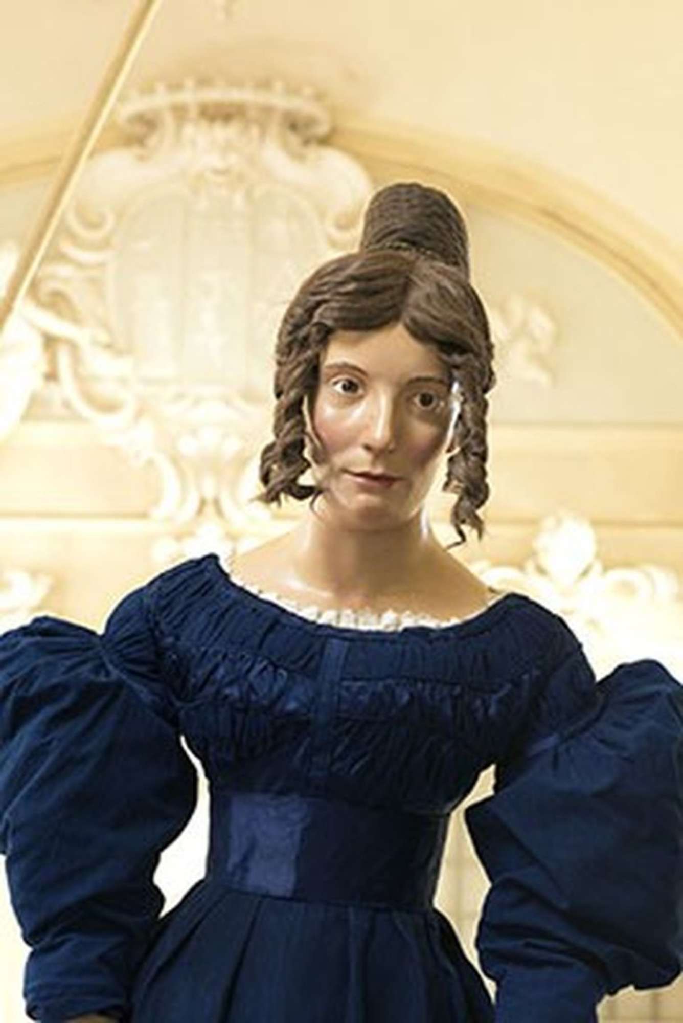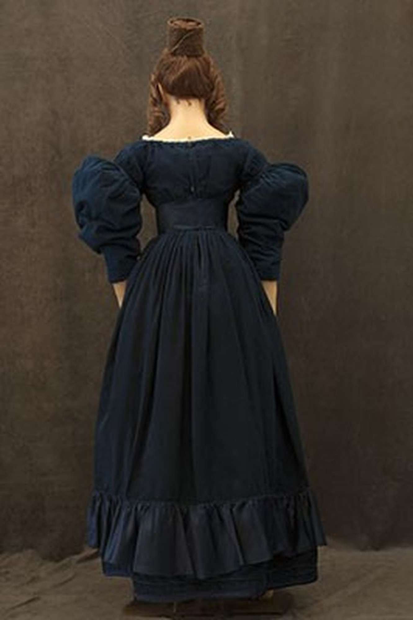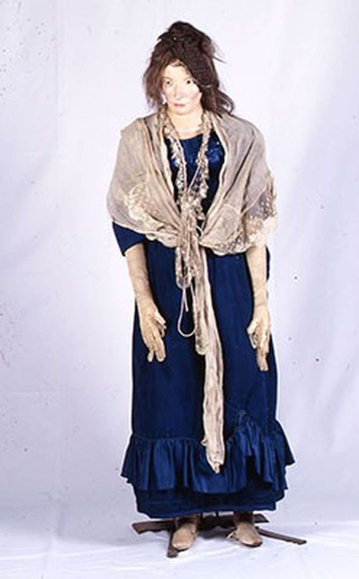 L'abbigliamento è composto da una camiciola, un corsetto, una sottoveste in cotone, una sottogonna, un abito in velluto di seta bluette, ha calze si seta, i guanti in pizzo, uno scialle in lino e pizzo, una calzatura, una borsa in pelle scamosciata un ombrello. La testa è eseguita in stucco dipinto con occhi in vetro e capelli veri ormai quasi completamente mancanti.