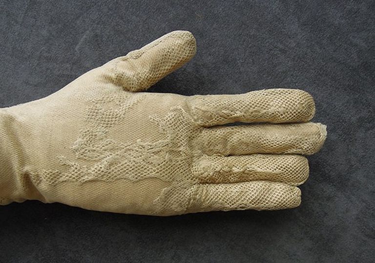 Fermature provvisorie su reticella e lavaggio-posizionamento guanti in pizzo Rimontaggio guanti originali e ricomposizione-fermatura margini delle lacune a cucito ancorandosi ai nuovi guanti in maglina