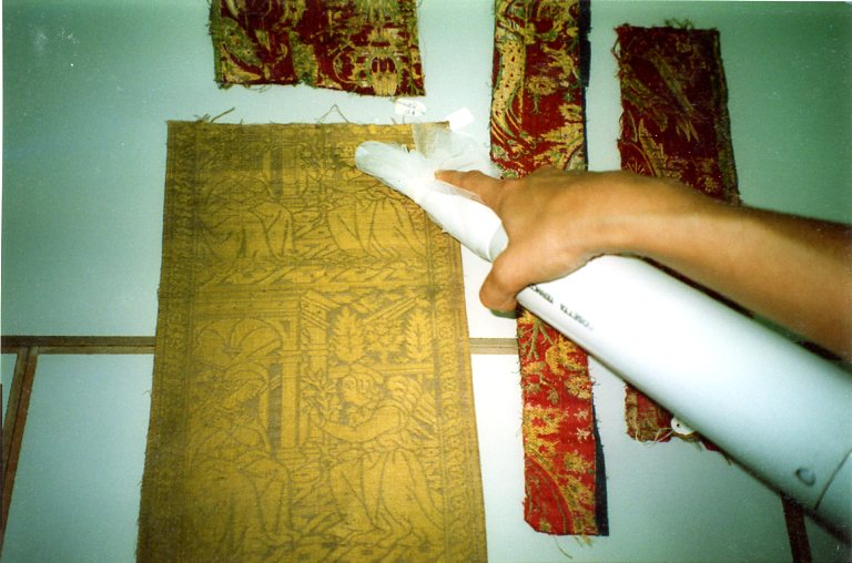 -aspirazione meccanica della polvere superficiale con l'ausilio di un mini aspiratore a bassa potenza, tenuto a debita distanza e proteggendo preventivamente i tessuti con una rete morbida di tulle su ambo i lati dei frammenti.
