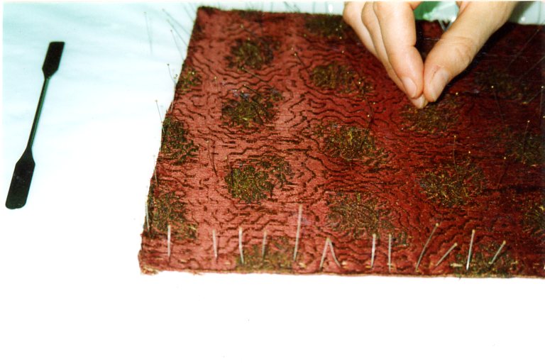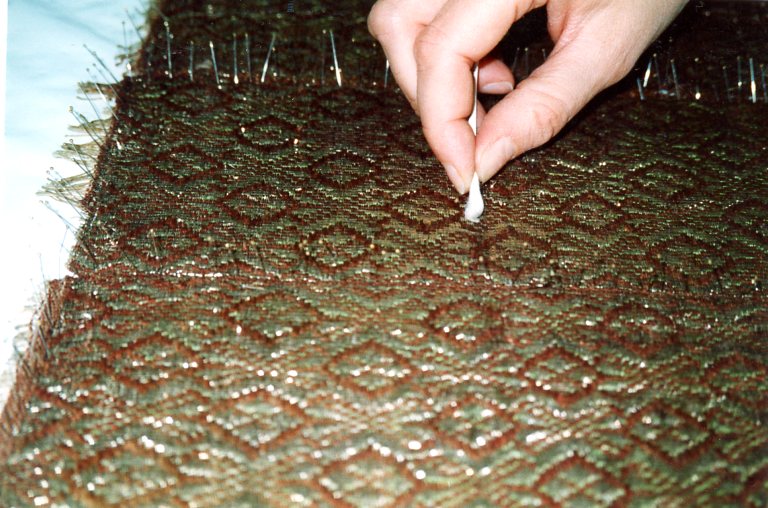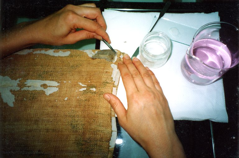 su tavolo con lastra in cristallo, mediante l'aiuto di pesini e vetrini oppure tramite spilli entomologici su foglio in polistirolo ricoperto di polietilene, e lasciati asciugare a temperatura ambiente o in qualche caso (tessuti spessi) con l'aiuto di ventilatori. I manufatti lavati con solvente sono stati vaporizzati per reidratare le fibre e successivamente riposizionati tramite spillatura con spilli entomologici su un foglio in polistirolo rivestito di polietilene.