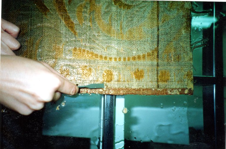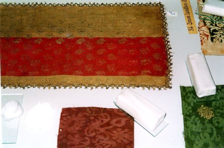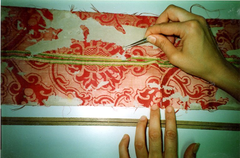 con "punto festone" dei margini sfilacciati su ogni frammento e un'intervento con supporti solo su manufatti particolarmente interessanti e danneggiati. Questi frammenti, caratterizzati da lacerazioni o lacune sono stati consolidati con supporti locali o con supporto totale fermati al tessuto antico con filze poste a scacchiera; le lisature le lacerazioni e le lacune sono state fermate con "Punto Posato" eseguito con organzino di seta di colore adeguato, ed ago chirurgico ricurvo.