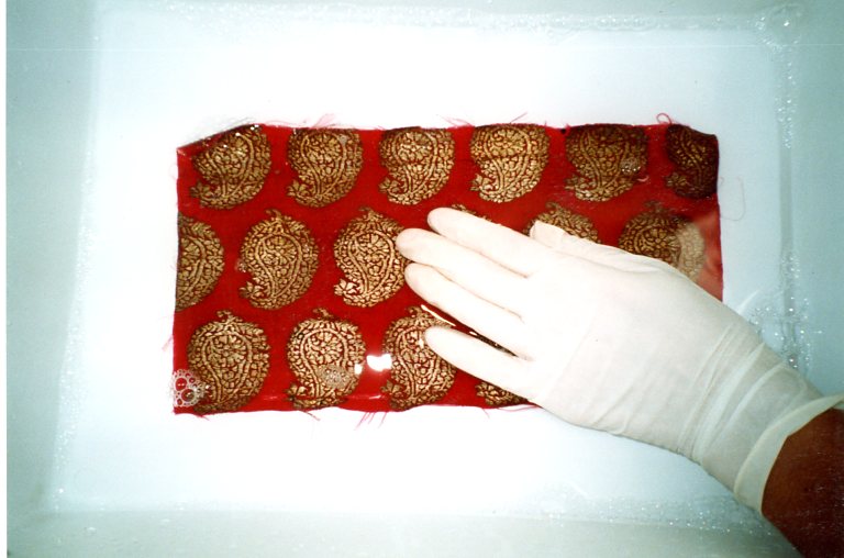 test negativo, lavaggio per immersione in acqua per reidratare le fibre molto secche immergendo il tessuto, sorretto da un foglio di melinex per agevolare gli spostamenti, in acqua dolce e detergente neutro (tinovetina), per quindici minuti, si è poi proceduto con vari risciacqui per eliminare lo sporco e i residui di detergente