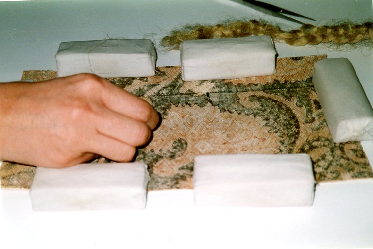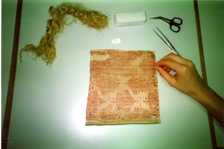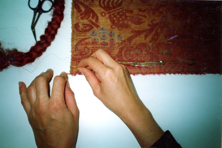 utili per il consolidamento ad ago dei frammenti tessili, sono stati tinti all'interno dal laboratorio per raggiungere una tinta più vicina possibile all'originale,con coloranti "Ciba" (Irgalan) stabili nel tempo.