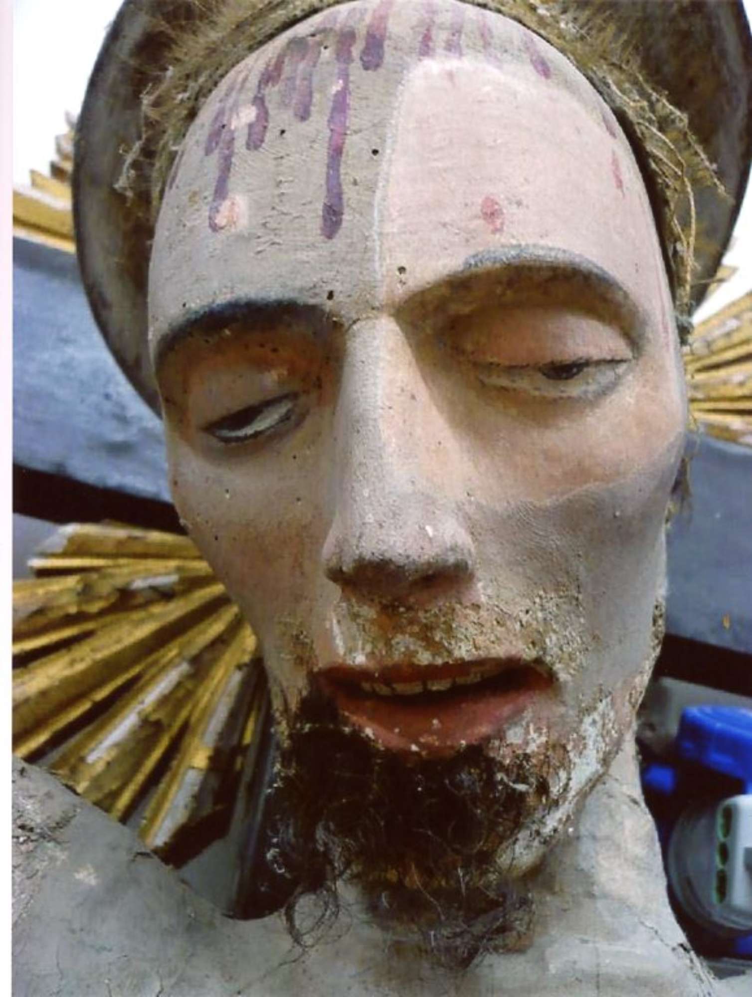 arati e ricollocata sulla testa del Crocifisso. restauro della croce; questa è opera diun assemblaggio in quanto le parti applicate dorate sono di epoca settecentesca mentre la croce è di epoca ottocentesca. Saggi preliminari hanno evidenziato che sotto lo smalto marrone vi era una policromia nera facilmente riportata alla luce con solventi idonei . Tutte le parti dorate insieme alla cartella I.N.R.I sono state pulite dalla polvere con acqua e ammoniaca al 2096 stuccate le lacune con gesso e colla animale e reintegrate con i colori a vernice e foglia oro. Ultimato il restauro la scultura è stata ricollocata sulla croce non fissandola alle braccia troppo delicate ma tramite una barra di ferro passante attraverso un foro già esistente sulla schiena e sulla croce con lo scopo di non gravare il peso sugli arti.